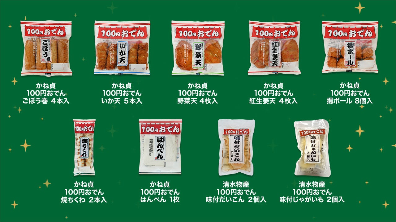 「ごぼう巻」「いか天」「野菜天」「紅生姜天」「揚ボール」「焼ちくわ」「味付だいこん」「味付じゃがいも」「はんぺん(※関東限定)」