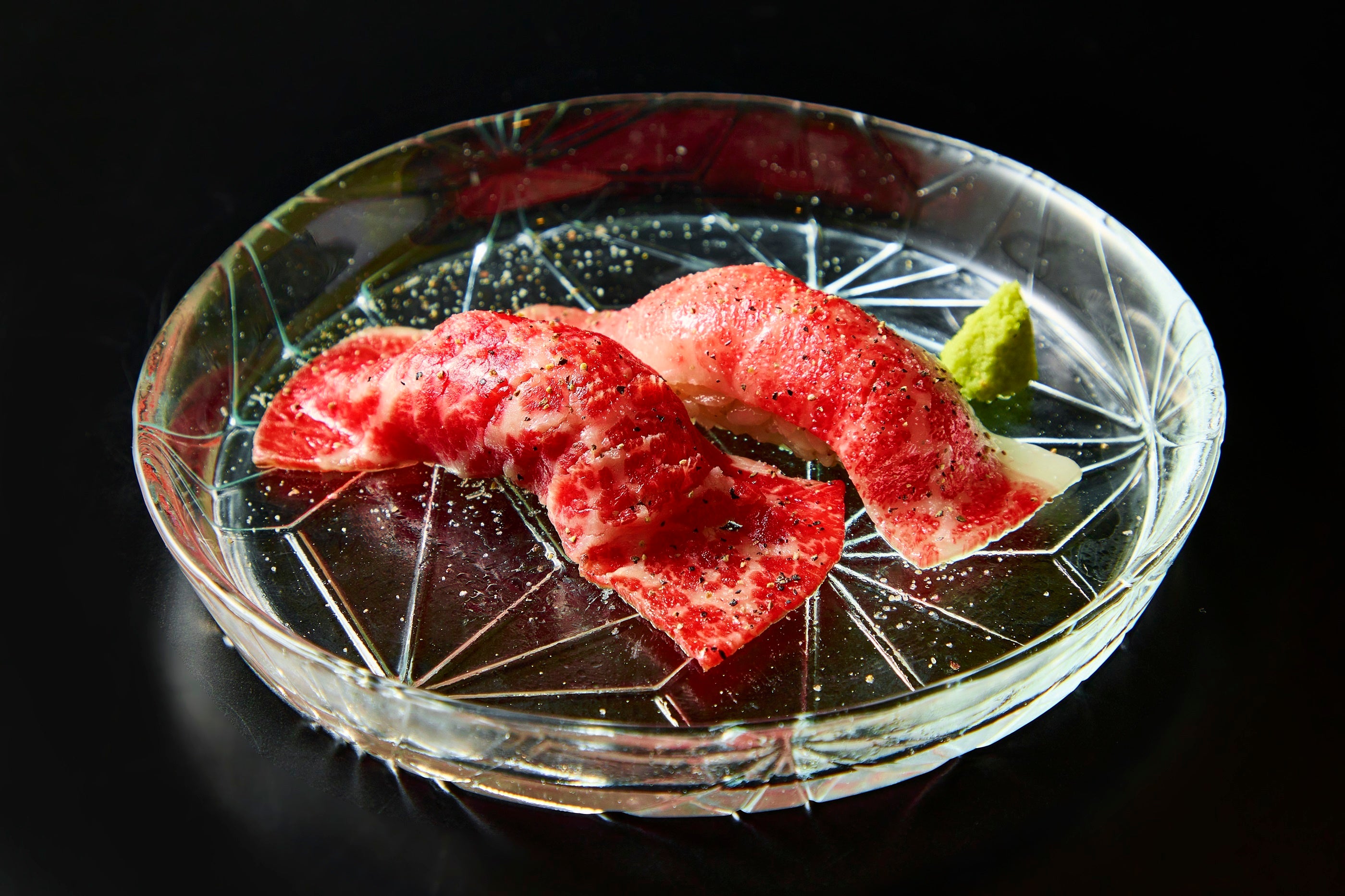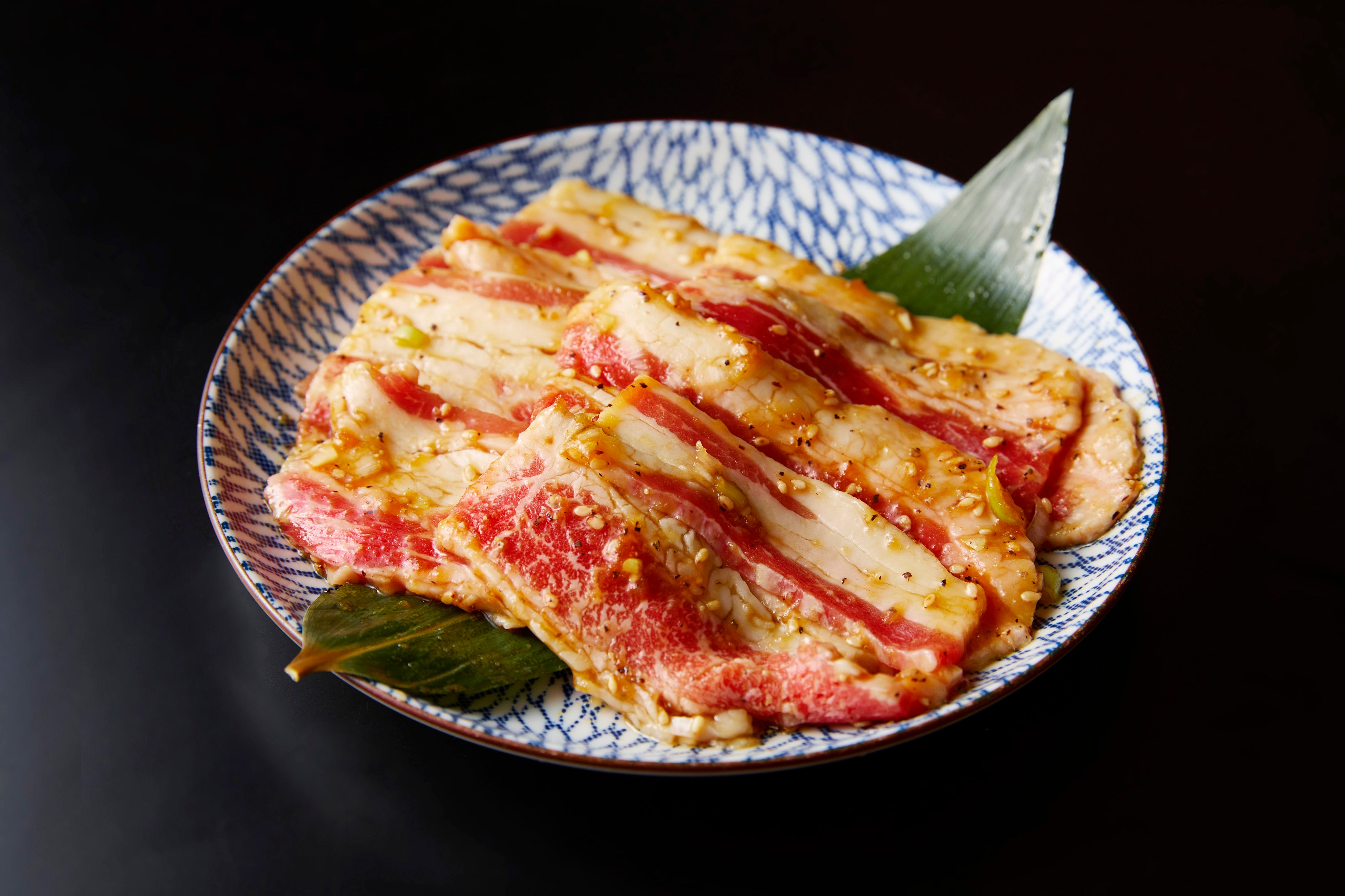 近江牛のバラ肉の中でも、厳選した上モノ部位である、「カイノミ、フランク、インサイド、タテバラ」のみを使用。秘伝の揉みダレを組み合わせることで、とてつもない旨味が出てくるのが特徴です。