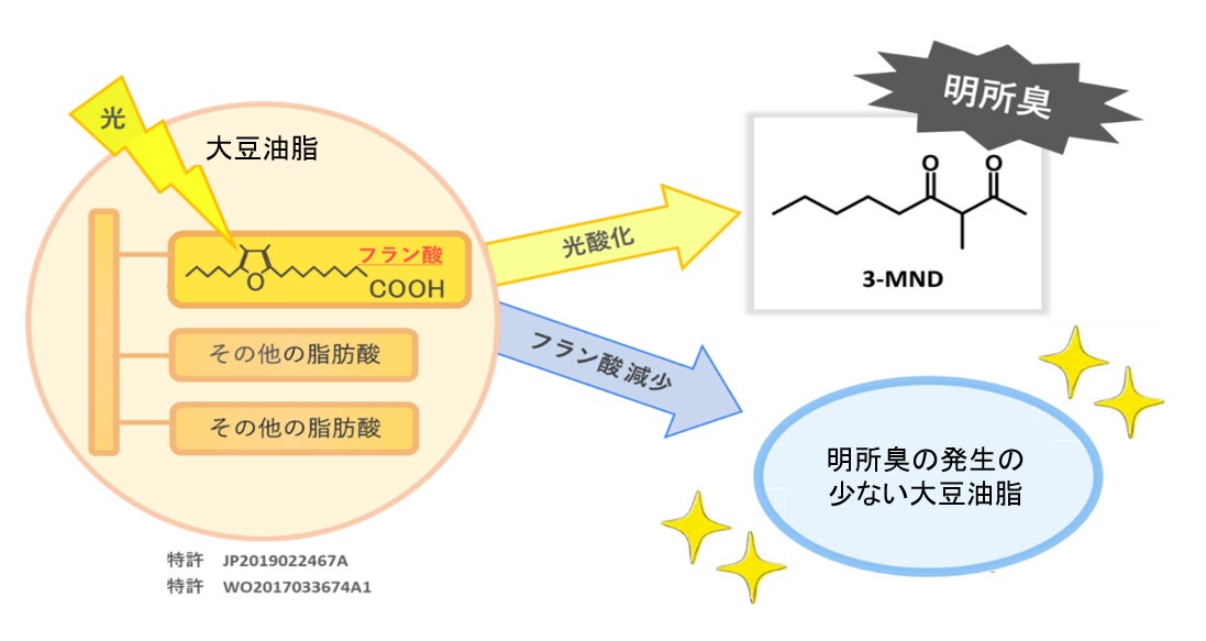 食用油は光や熱によって劣化し、特に大豆油は光にあたることによって明所臭と呼ばれる枯草のような特有の臭いが発生します。当社はこれまでの研究で、この明所臭の原因が、脂肪酸の一種であるフラン酸が光酸化によって分解されて発生する3メチル2,4-ノナンジオン(3-MND)であることを明らかにしてきました。しかし、フラン酸を生合成する遺伝子が何であるかは解明できていませんでした。
