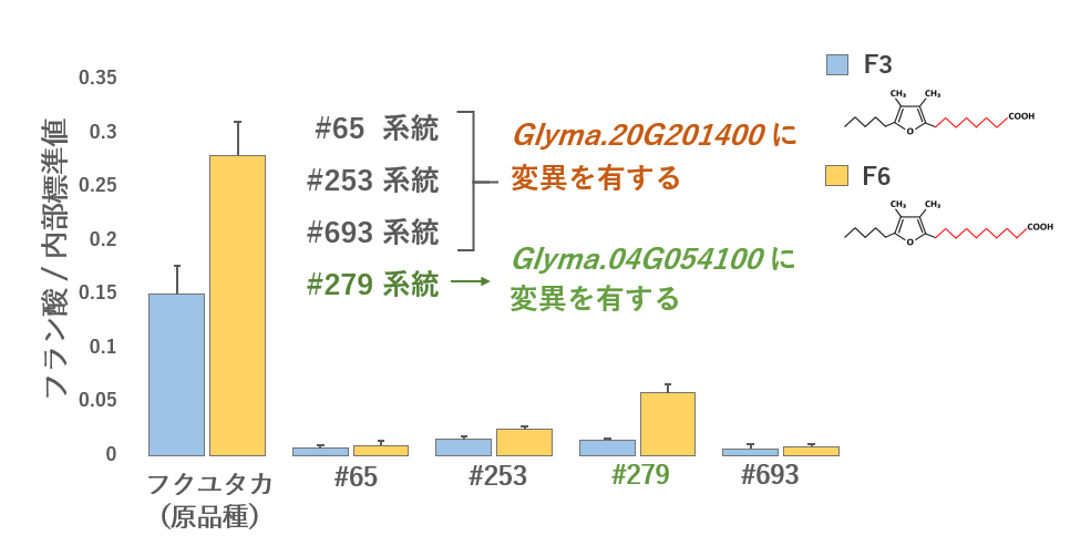当社、佐賀大学および九州大学は、大豆油の明所臭を抑制するため、明所臭の原因となるフラン酸が欠損する大豆の開発に取り組んできました。このたび、当社、佐賀大学および九州大学は、フラン酸が減少した突然変異系統の大豆を見いだし、これを利用して、大豆のフラン酸の生合成に関わる遺伝子(Glyma.20G201400 および Glyma.04G05690)を世界で初めて発見しました。