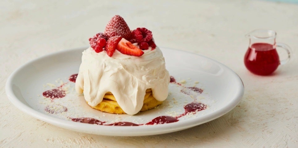 北海道産発酵バターを使用したこだわりのパンケーキの間にカスタードクリームやいちご、キウイをサンドし、たっぷりのマスカルポーネクリームでデコレーションしたショートケーキのような味わいのパンケーキです。フルーツの甘酸っぱさやクリームのまろやかなコクが絶妙にマッチしており、お好みで別添えのストロベリーソースをかけてお召し上がりください。