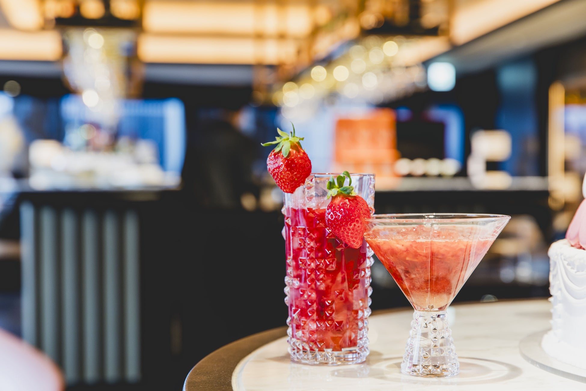 「ル バー フォション」では、赤くて美しいあまおうを使用したカクテルとモクテルをご提供いたします。「ストロベリーフィールズ」、イチゴ畑と名付けられたドリンクには贅沢に大きなあまおうの果実をふんだんに使用。飲んだ瞬間に口いっぱいに広がる風味豊かなイチゴの味をお楽しみください。