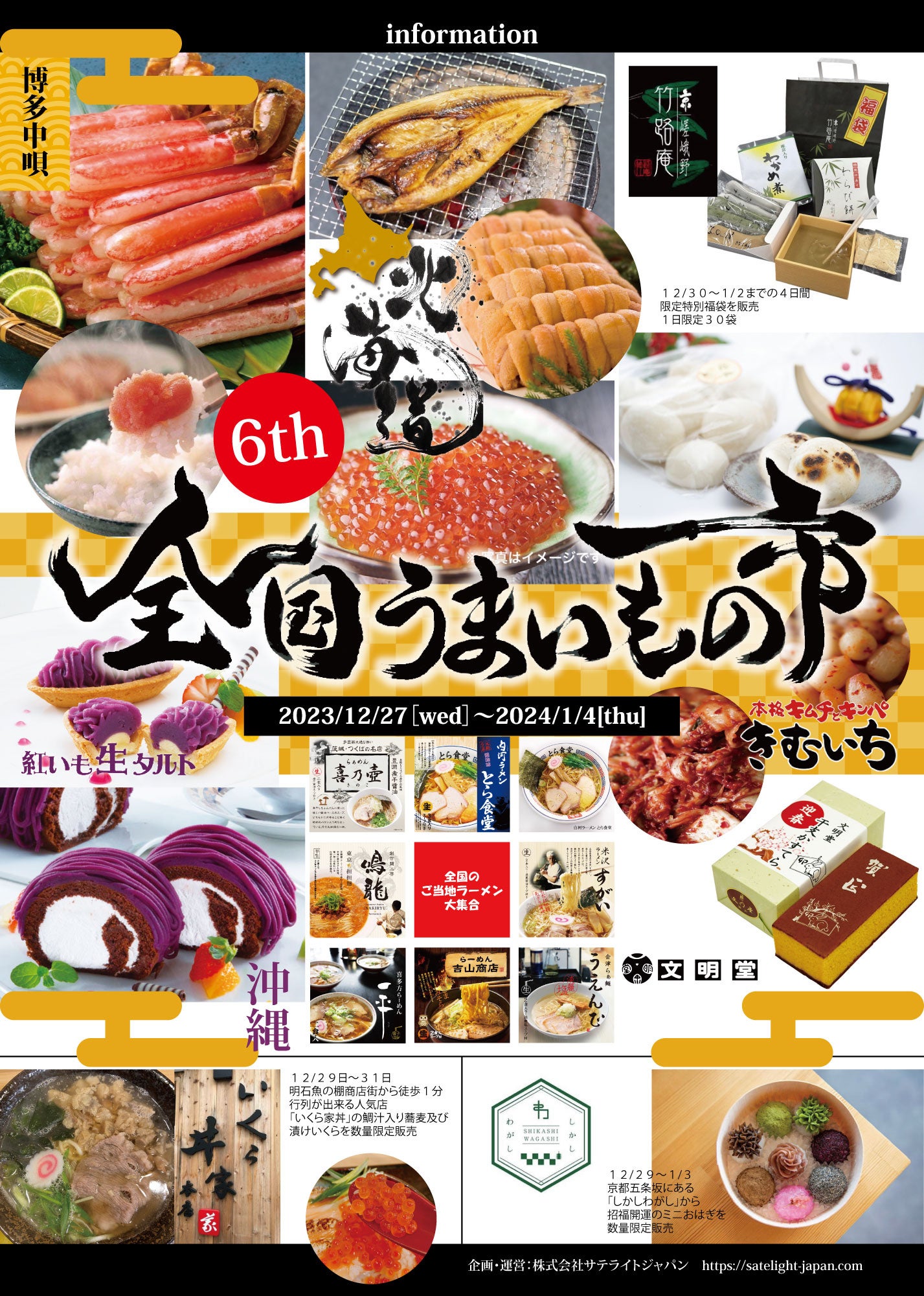 今年で6回目の開催となる「全国うまいもの市」は、年末年始の恒例行事として多くのお客様にご来場いただいている人気のイベント!物産品からスイーツまで幅広い商品を取り揃えて皆様のお越しをお待ちしております。