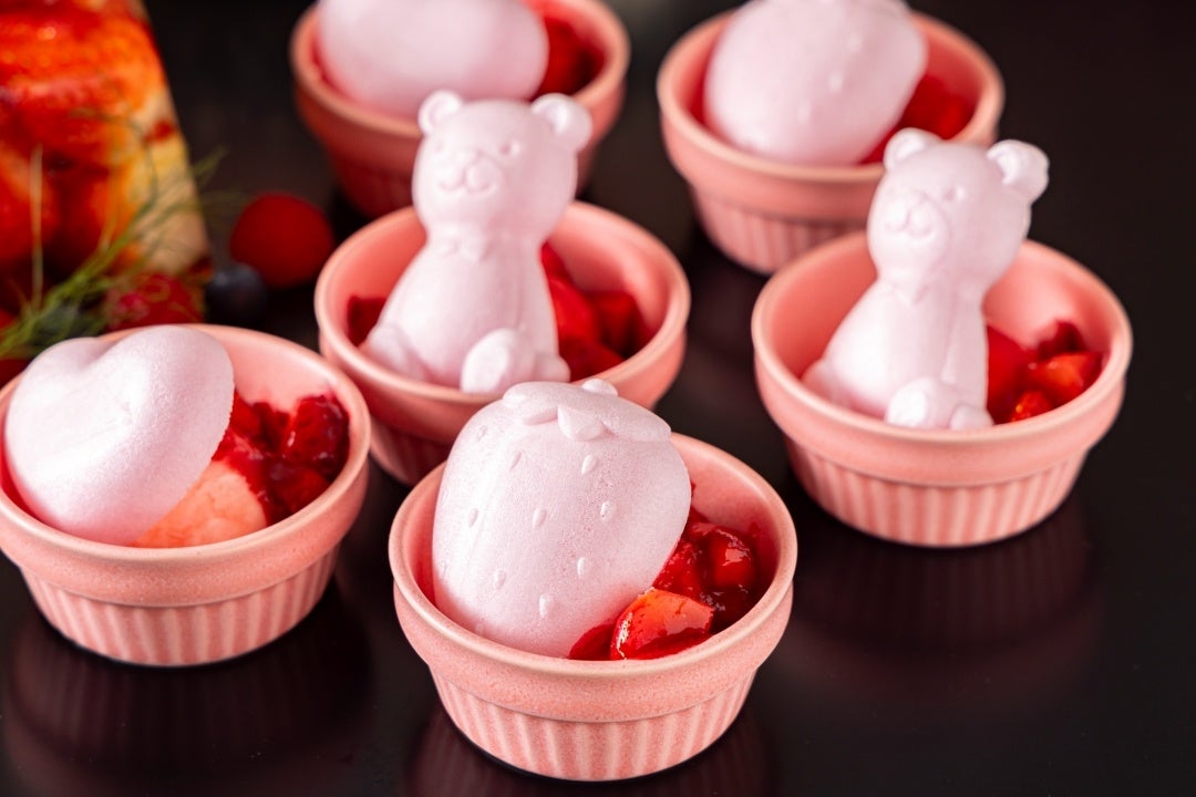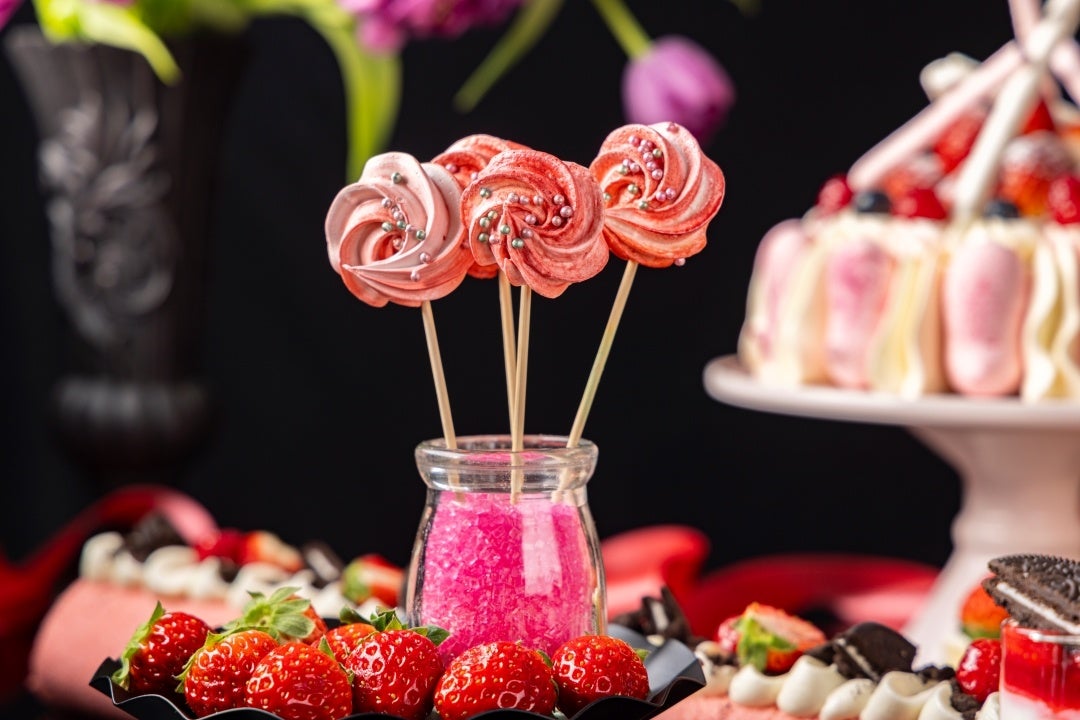 フレッシュないちごをノンアルコール白ワインゼリーにぎっしり詰め込んだ「ストロベリーゼリーテリーヌ」は、切り分けた断面も美しい“萌え断”スイーツに。「ノスタルジーピンク」はライチといちごを組合わせたムースにクリームをレース状に重ねて華やかに彩り、どこか懐かしくも洗練されたリッチな味わいに仕上げました。しっとりと焼き上げたスポンジにいちごと生クリームをたっぷりサンドした「ストロベリーショートケーキ」、贅沢にいちごをあしらいジュエリーのような美しさの「ストロベリータルト」、いちごをカスタードクリームと一緒にストロベリースポンジで巻きあげブラッククッキーやいちごをトッピングした「ストロベリーロールケーキ」など、王道のいちごスイーツも存分にお楽しみいただけます。その他、メレンゲをストロベリーカラーで焼き上げたサクサク食感の「フラワーポップ」、ピンク色に焼き上げたクッキーシューに、フレッシュないちごとストロベリーカスタードクリームをたっぷり詰めた「ストロベリーシュークリーム」など、旬ないちごを贅沢に使用したスイーツが並びます。さらに、ほのかな塩味のあるプレッツェルをホワイト&ブラックチョコレートでデコレーションした「プレッツェル」や、砕いたブラッククッキーとクリームを重ねてストロベリークーリーを添えた「ブラックベリーヌ」など、“ブラック”ないちごスイーツもご用意。シェフ厳選の東海地方中心のフレッシュいちごもお好きなだけお召し上がりいただけます。
