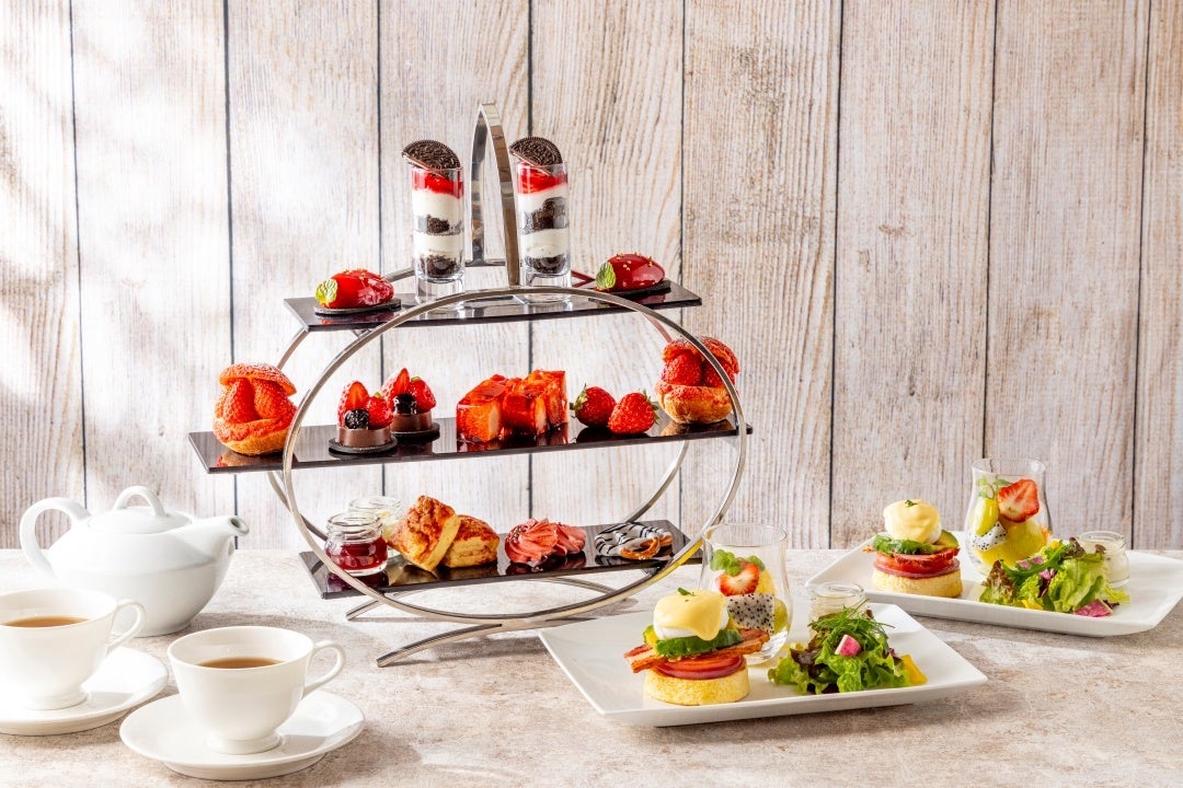 いちごスイーツ8種類、スコーン1種類、エッグベネディクト、フラワーサラダランチドレッシング添え、フレッシュフルーツサラダなどの朝ならではのセイボリー3種類をご用意しました。ご一緒に、バリスタが淹れた香り高いコーヒーや紅茶をお好きなだけお楽しみいただけます。