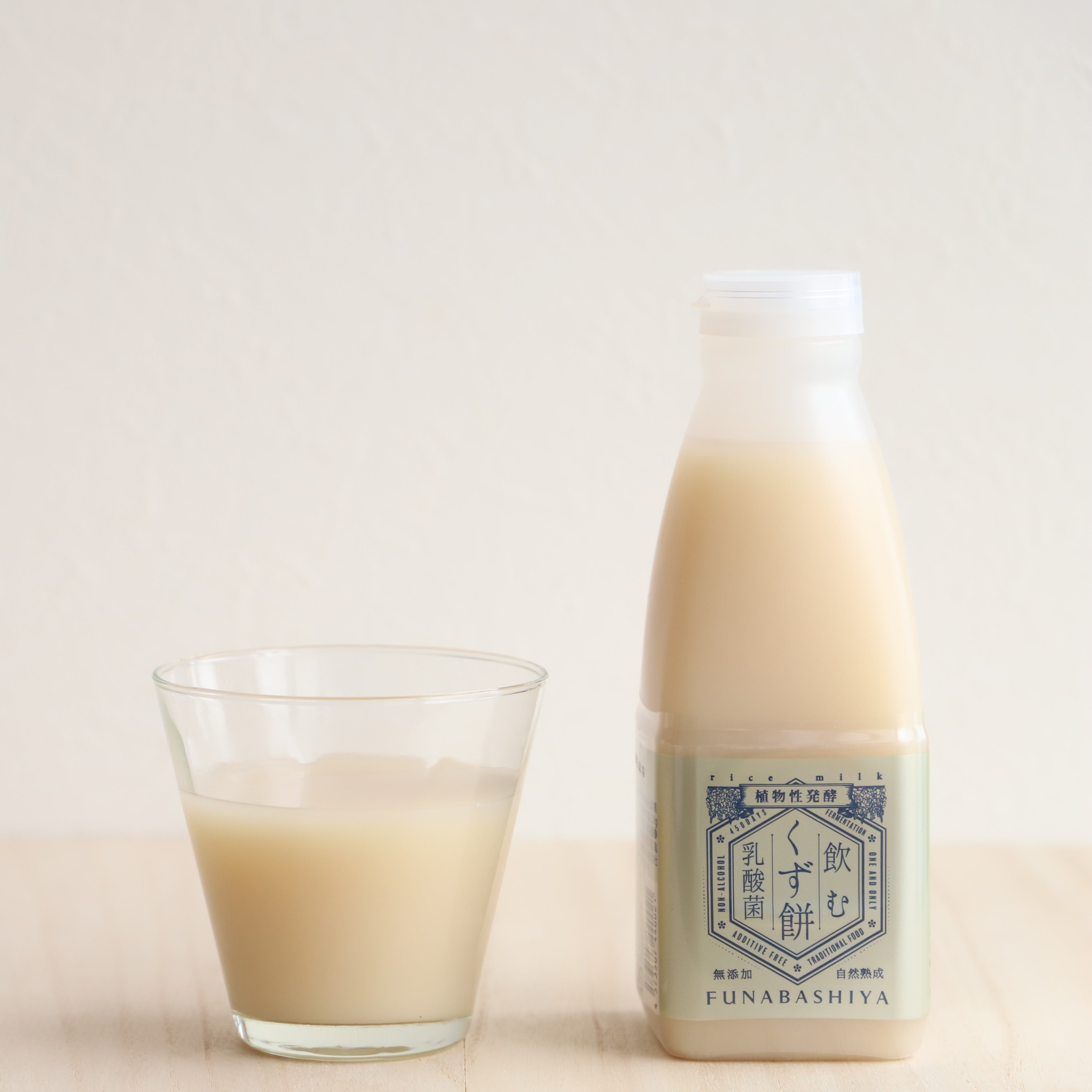 船橋屋の看板商品であるくず餅は江戸から続く和菓子唯一の発酵食品。飲むくず餅乳酸菌はくず餅の発酵槽の中から発見した”くず餅乳酸菌®”を使った身体にやさしいドリンクです。身体にやさしいものをそのままお届けしたいという想いから原料はお米と水・くず餅乳酸菌のみ。砂糖不使用、保存料不使用でお届けいたします。ほんのり香る甘さはお米のでんぷんが分解されたもの。ボトル内でくず餅乳酸菌が発酵し、アミノ酸など494種の成分を作り出すことで完成します。程よい甘み加減と発酵加減で、熱処理により発酵を止めてボトリングしました。