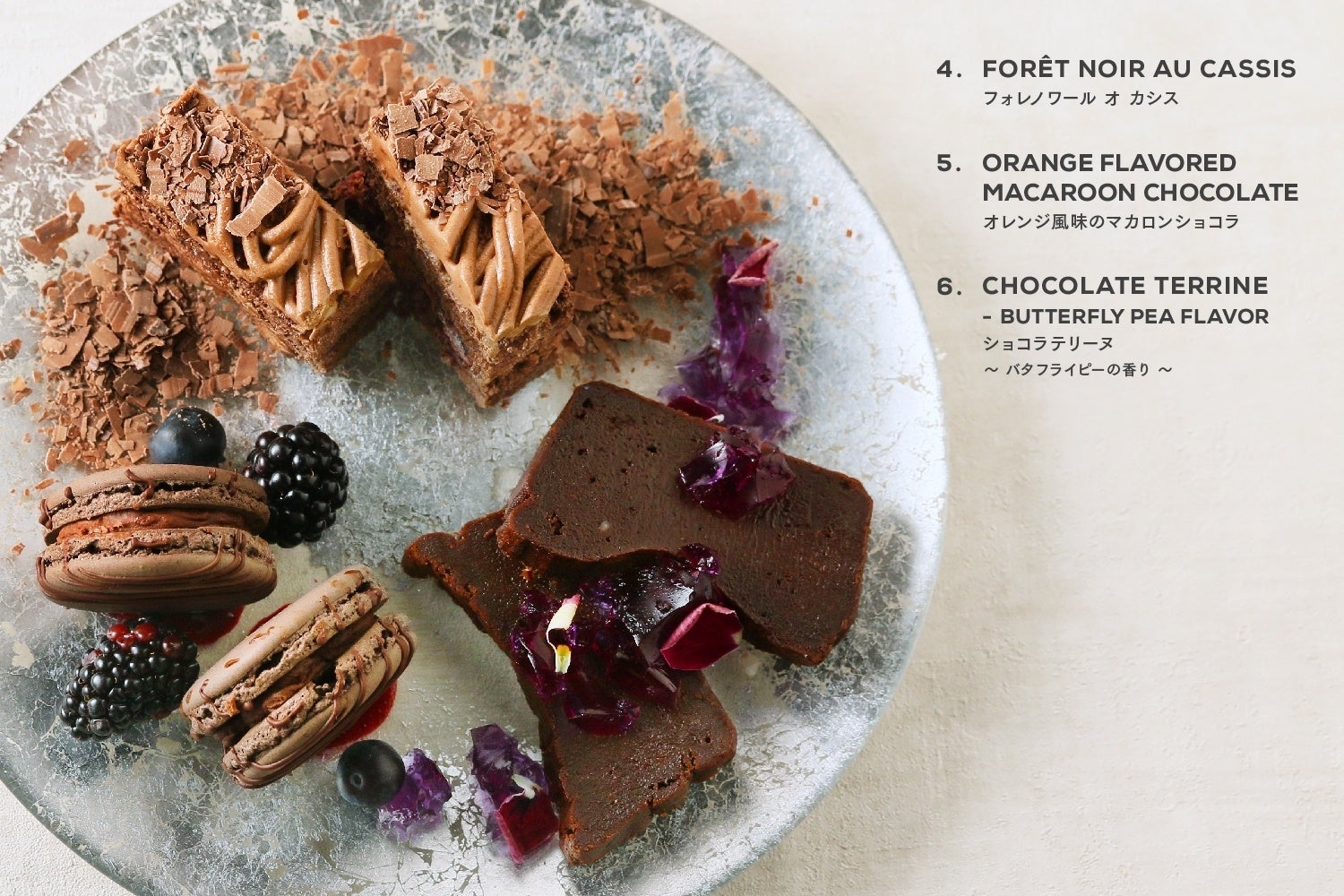 フレーズショコラ・オペラ・ショコラテリーヌなど、チョコづくしのラインナップが各皿のテーマカラーに彩られ、華やかな大人のアフタヌーンティーを演出します。