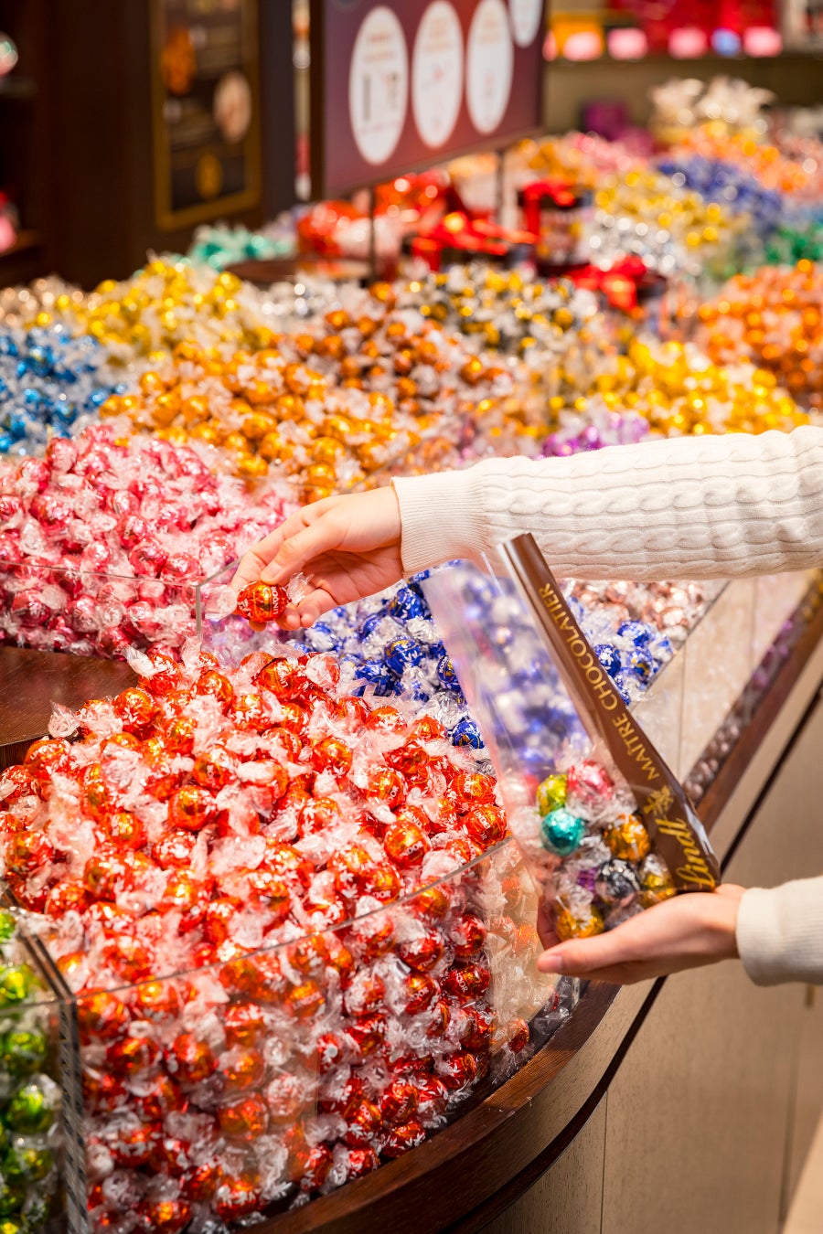 「リンドール」は、なめらかな口どけのフィリングと繊細なシェルの2層構造が特徴のチョコレートです。その贅沢な口どけは食べる人を魅了し、発売から60年以上世界中で愛されています。リンツの直営店では、定番フレーバーと期間限定フレーバーあわせて20種類以上をご用意しており、様々なフレーバーの中からお好きなものをお好きなだけ量り売りで購入できる「PICK&MIX」をお楽しみいただけます。
