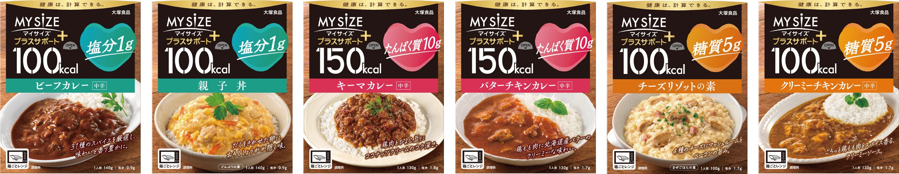 カロリーに加え、「塩分1g」、「たんぱく質10g」、「糖質5g」と、気になる栄養成分量を一目で分かるよう表記することで、健康的な食事をより身近に取り入れていただける工夫をしています。『マイサイズ』シリーズで人気のカレーを中心に6品を展開し、おいしく満足感のある味づくりにこだわりました。