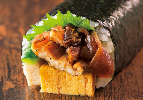 国産の活穴子の鮮度そのままに焼き上げた豊かな風味が味わえる恵方巻です。国産焼穴子、大葉、かんぴょう、きゅうり、玉子焼、おぼろ、高野豆腐、しいたけ煮と8種類の具材を使用しています。