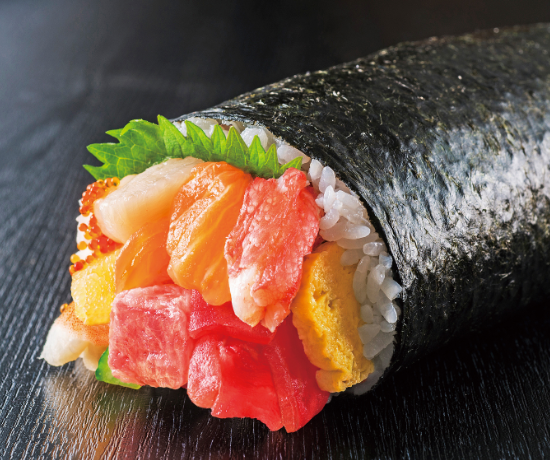八洲水産監修の天然本まぐろを使用しています。さらに北海道産のほたてや生サーモンなど計11 種類の具材が入ったボリューム満点の贅沢な太巻をぜひお召し上がりください。食べやすいハーフサイズもご用意しております。