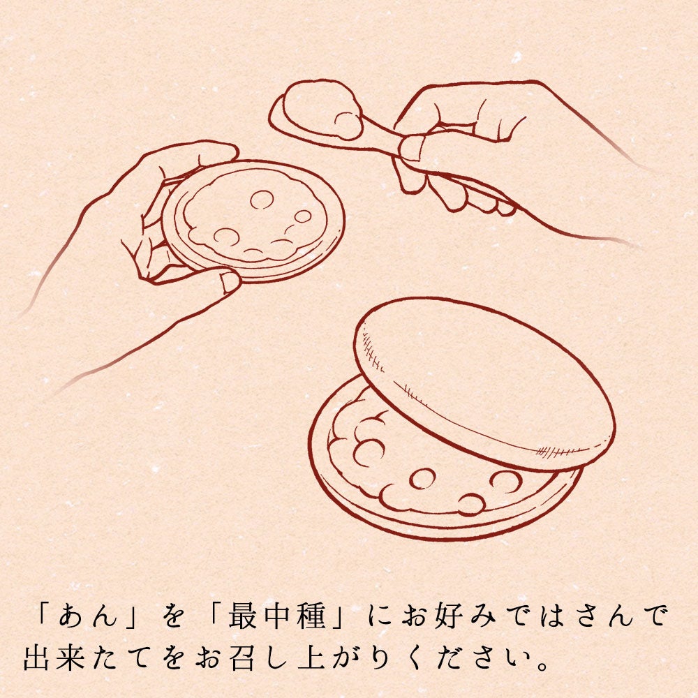 お召し上がりの前に、ご自分でお好きなだけの「小倉あん」を最中種にはさんで、できたてをお召し上がりいただきますと、風味満点です。