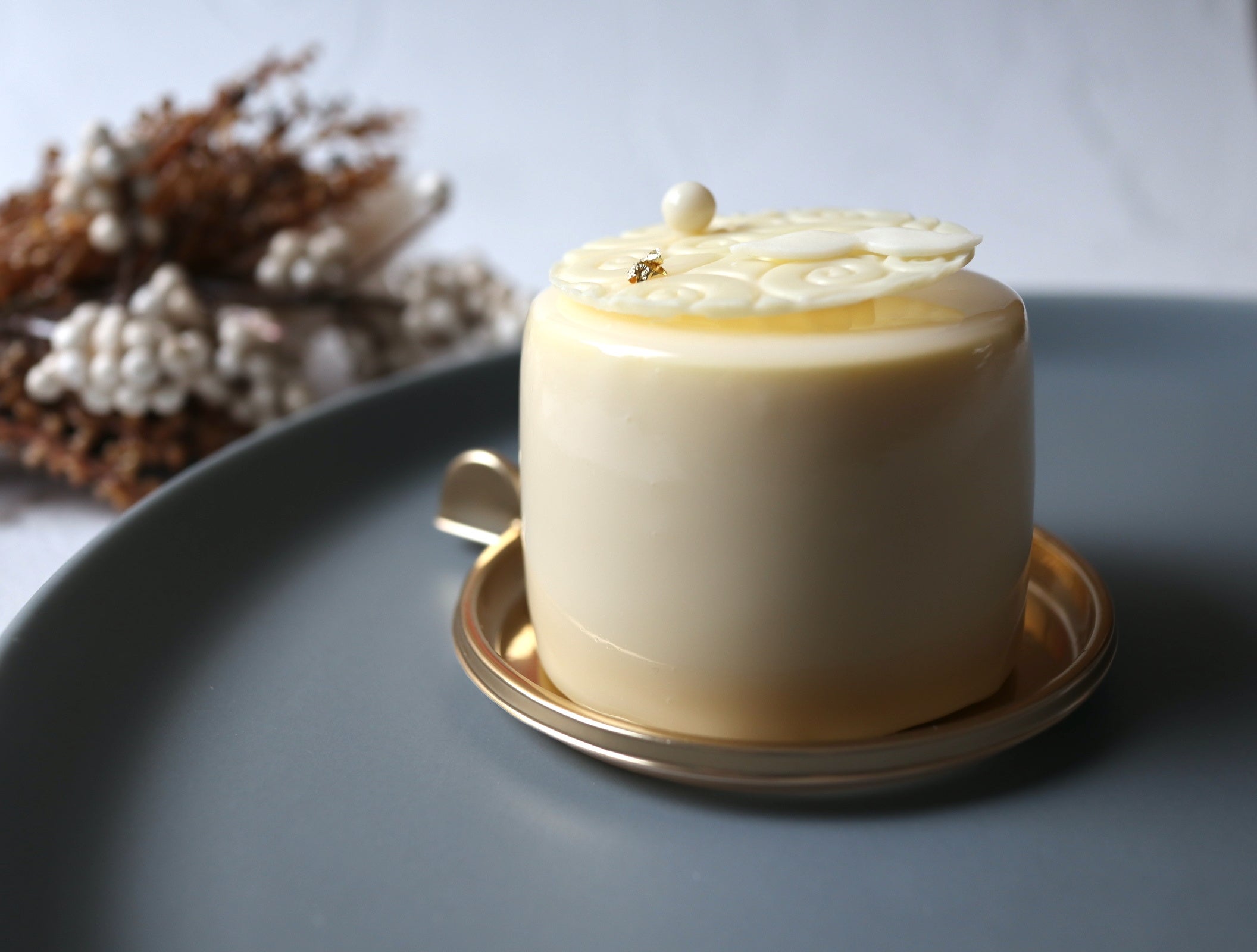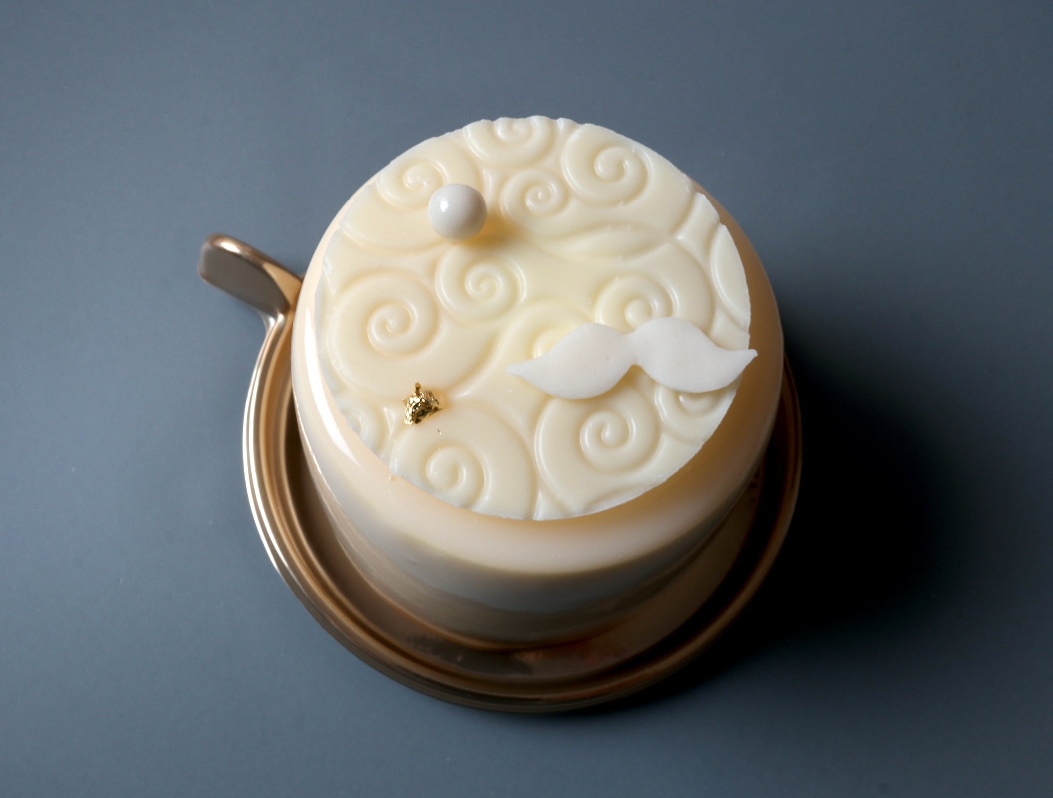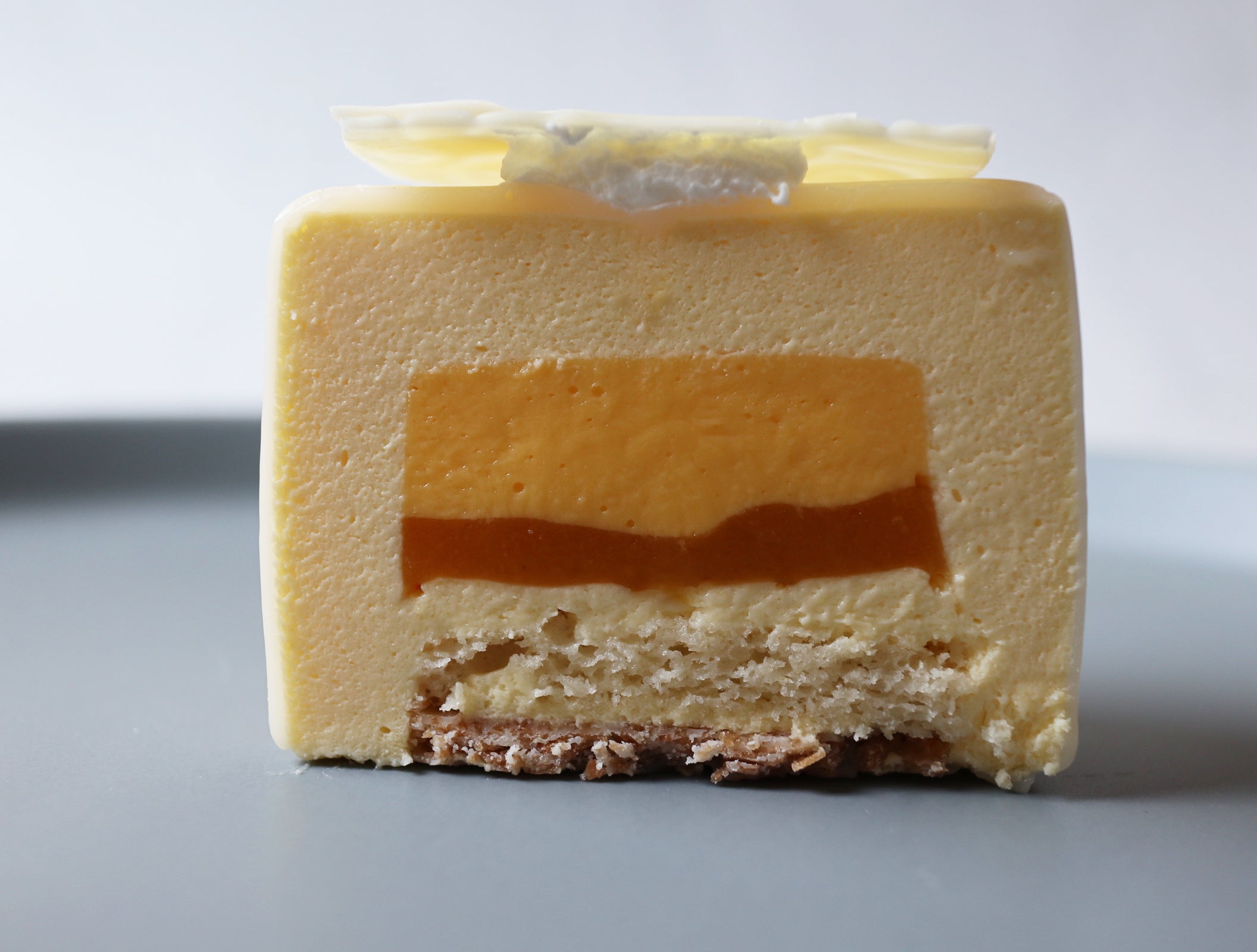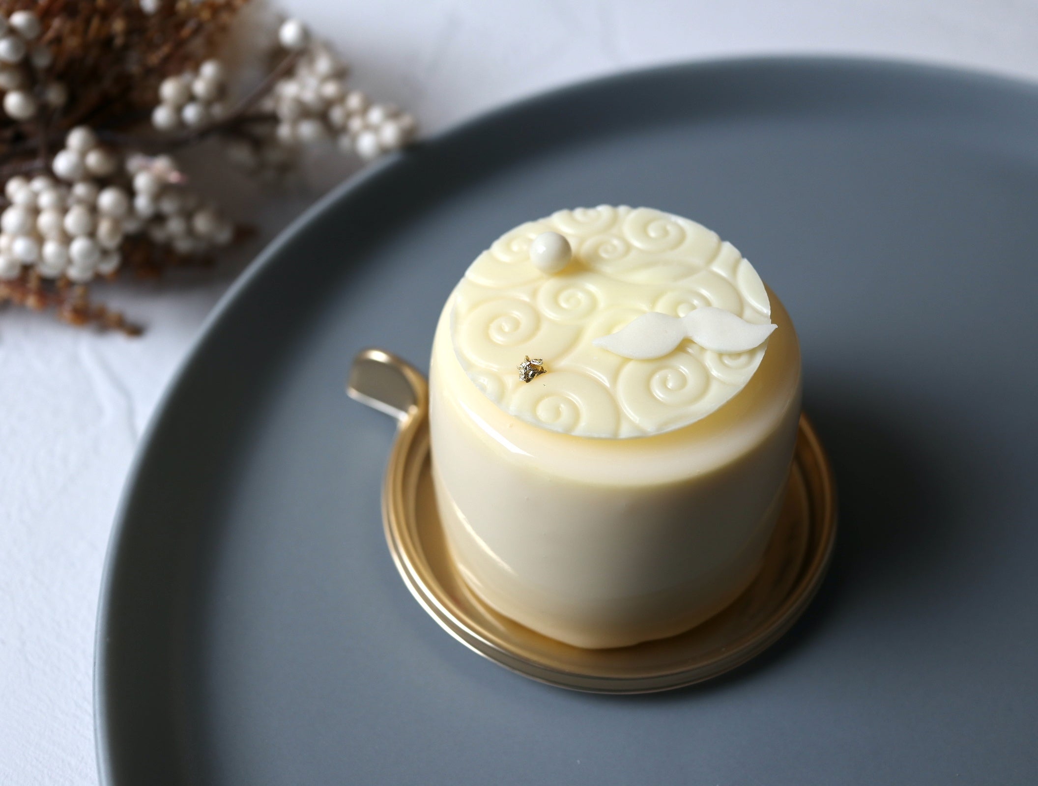 「白ダルマ」はホワイトチョコレートをベースにしたムースケーキで、中にアーモンド風味のスポンジ、カリカリの食感のフィアンティーヌ、柚子のムース、トロピカルのゼリーを入れた、さまざまな味わいや食感がお楽しみいただけるスイーツです。