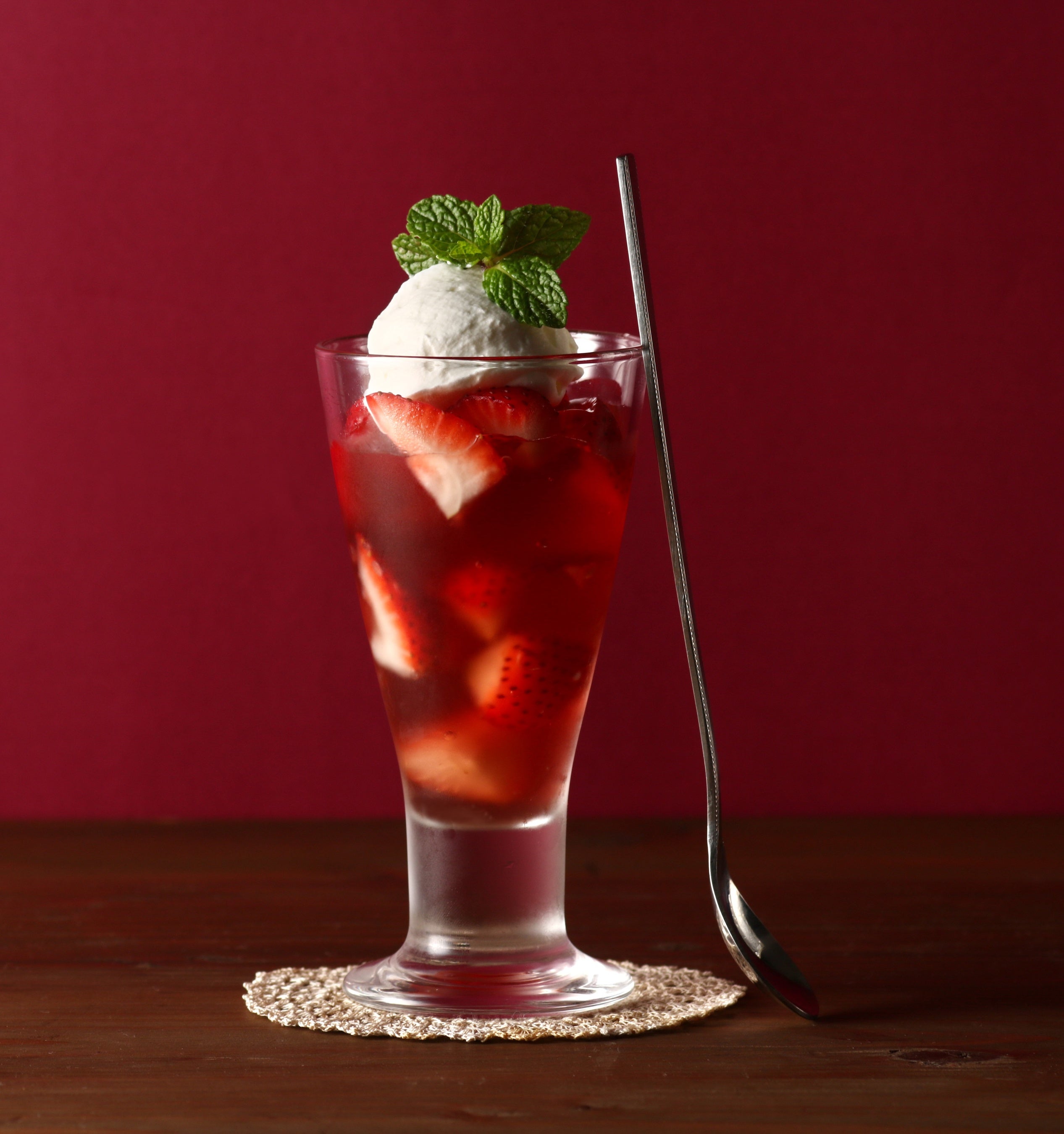 真っ赤な「あまおう」と真っ赤なざくろジュレを組み合わせた、見た目も鮮やかなジュレスイーツです。甘酸っぱいざくろジュレがたくさんの「あまおう」をやさしく包み込み、甘さを引き立たせます。