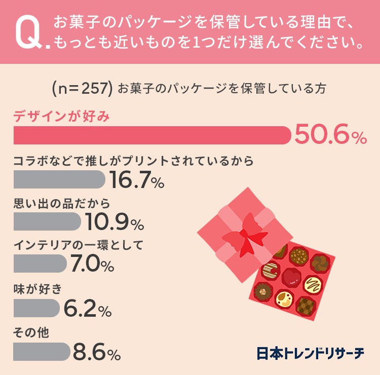 50.6%と半数以上の方が「デザインが好み」という理由でお菓子のパッケージを保管しているようです。