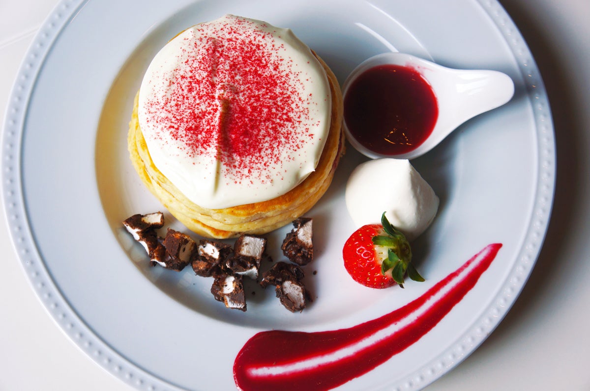 特製マスカルポーネクリームをたっぷりかけたティラミス風パンケーキ。