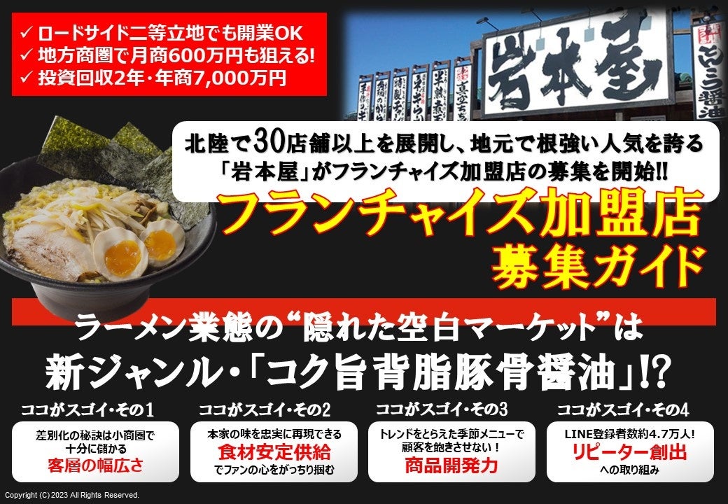 ▶「らーめん岩本屋」はフランチャイズ加盟・先行受付を開始いたしました。詳細は以下よりお問い合わせください。