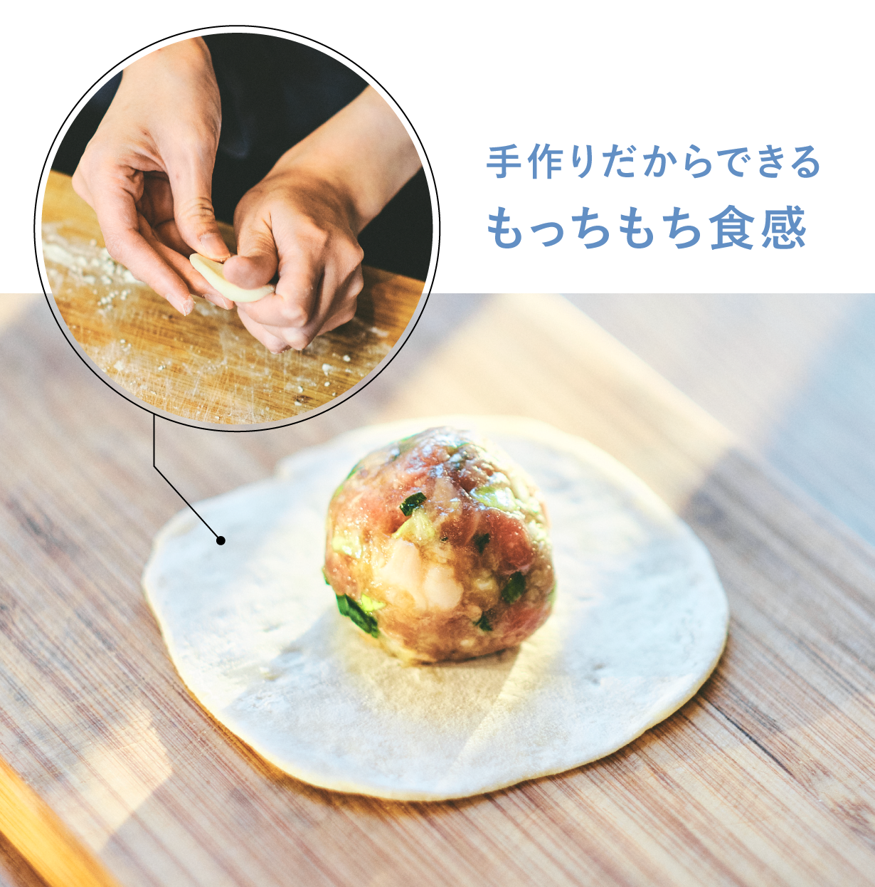 肉汁を包んだ餃子をお届けする為には、厚手の皮を採用する必要がありました。