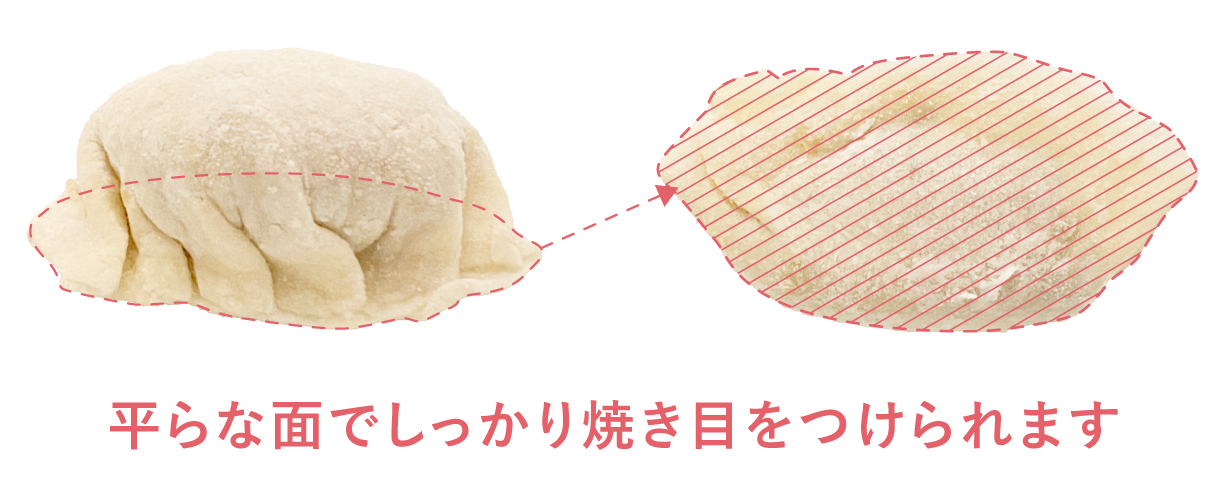 手包みでしかつくれないことを活かして「手包みでないとできない包み方」で美味しさを追求しました。肉汁を逃がさない為には「焼き目」をしっかりつけることが大事です。そこで「焼き目」がしっかりつくように平らになるように手包みしました。