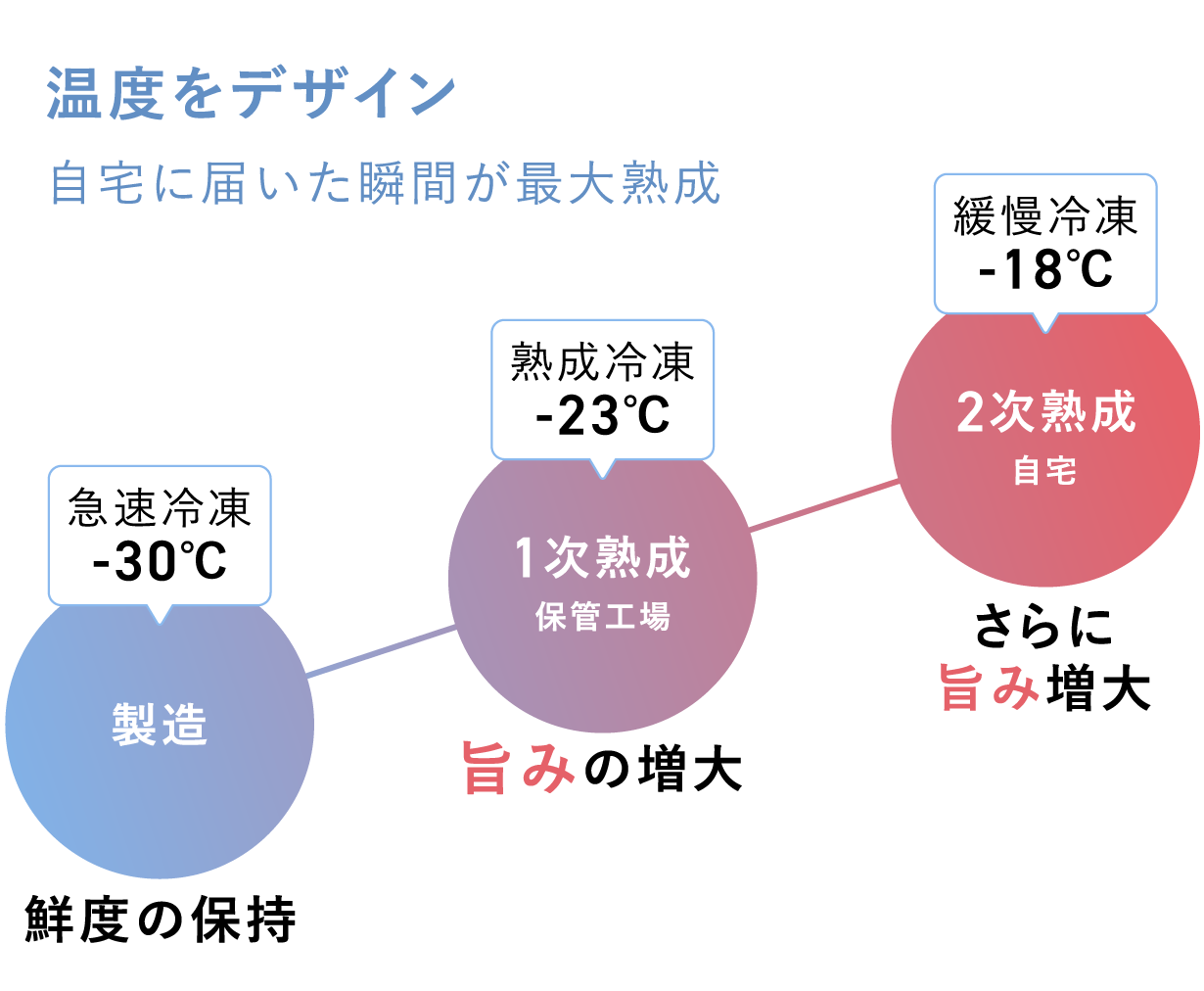 鮮度を守る急速冷凍。食材の旨味成分を増加させる熟成温度。自宅での2次熟成(保管温度)を商品設計の軸として組み込む事で美味しさを追及しております。