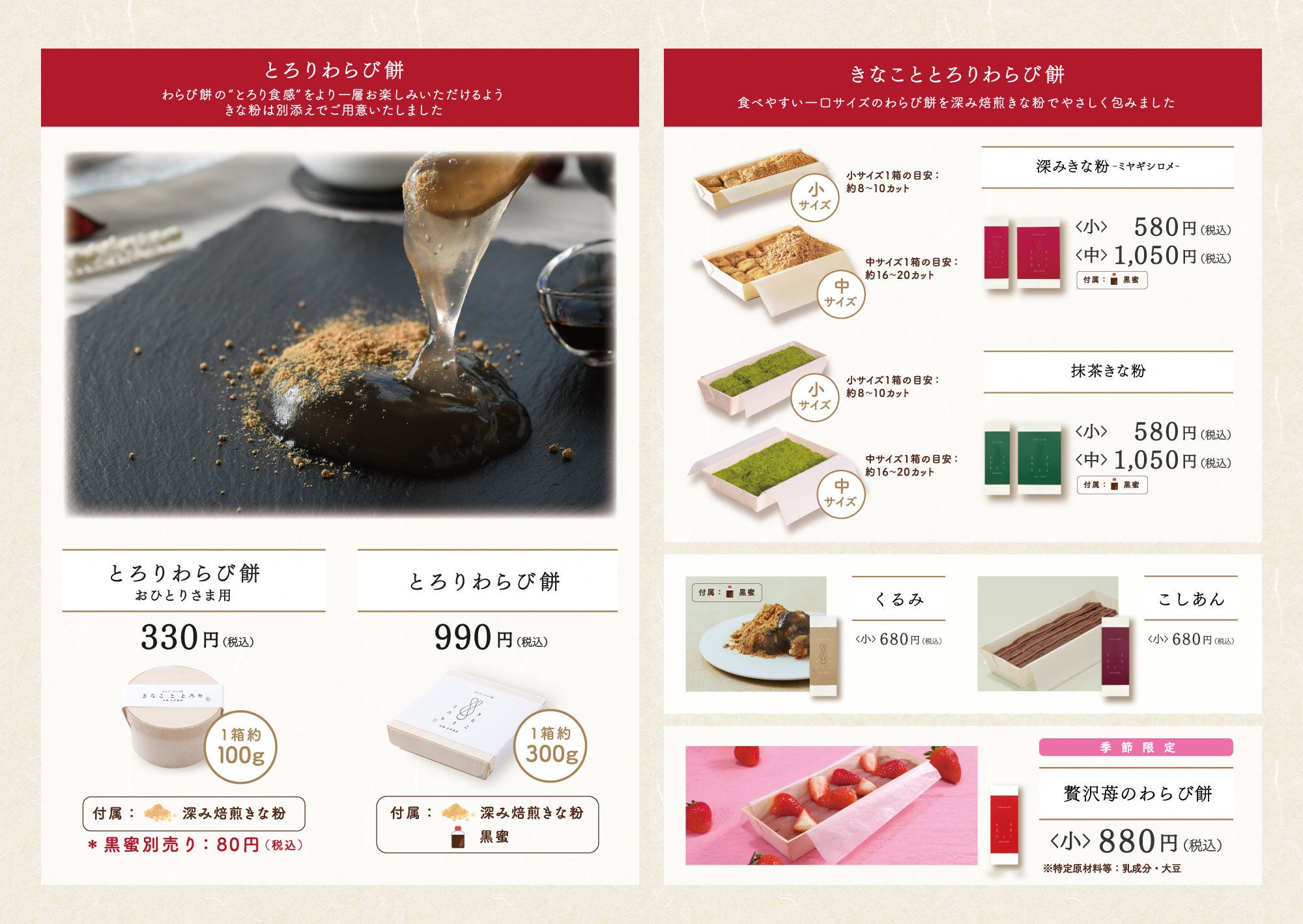 基本の深みきな粉-ミヤギシロメ-から、日本の四季折々の素材を使用した季節のわらび餅まで、「きょうもあしたも、京のわらび。」と、毎日お楽しみいただけるような商品をご用意しております。