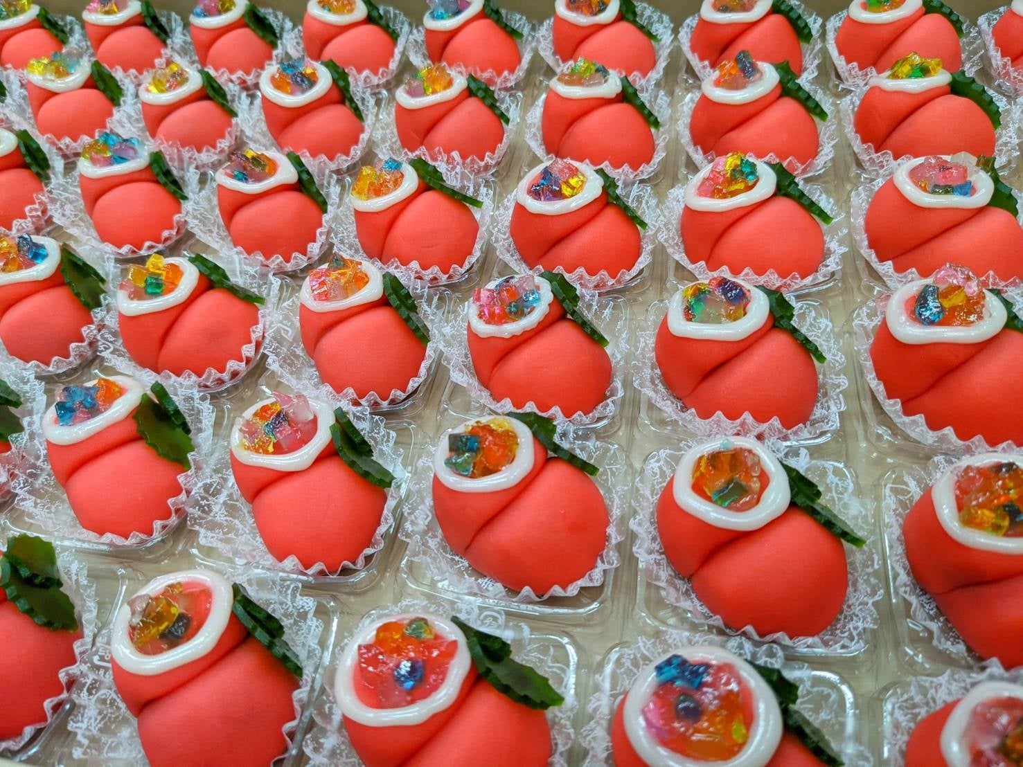 並んでるクリスマス和菓子たち、どこにお嫁に行くのかとワクワクドキドキしながら心を込めて作りました。また機会がありましたら、お店にお立ち寄りください
