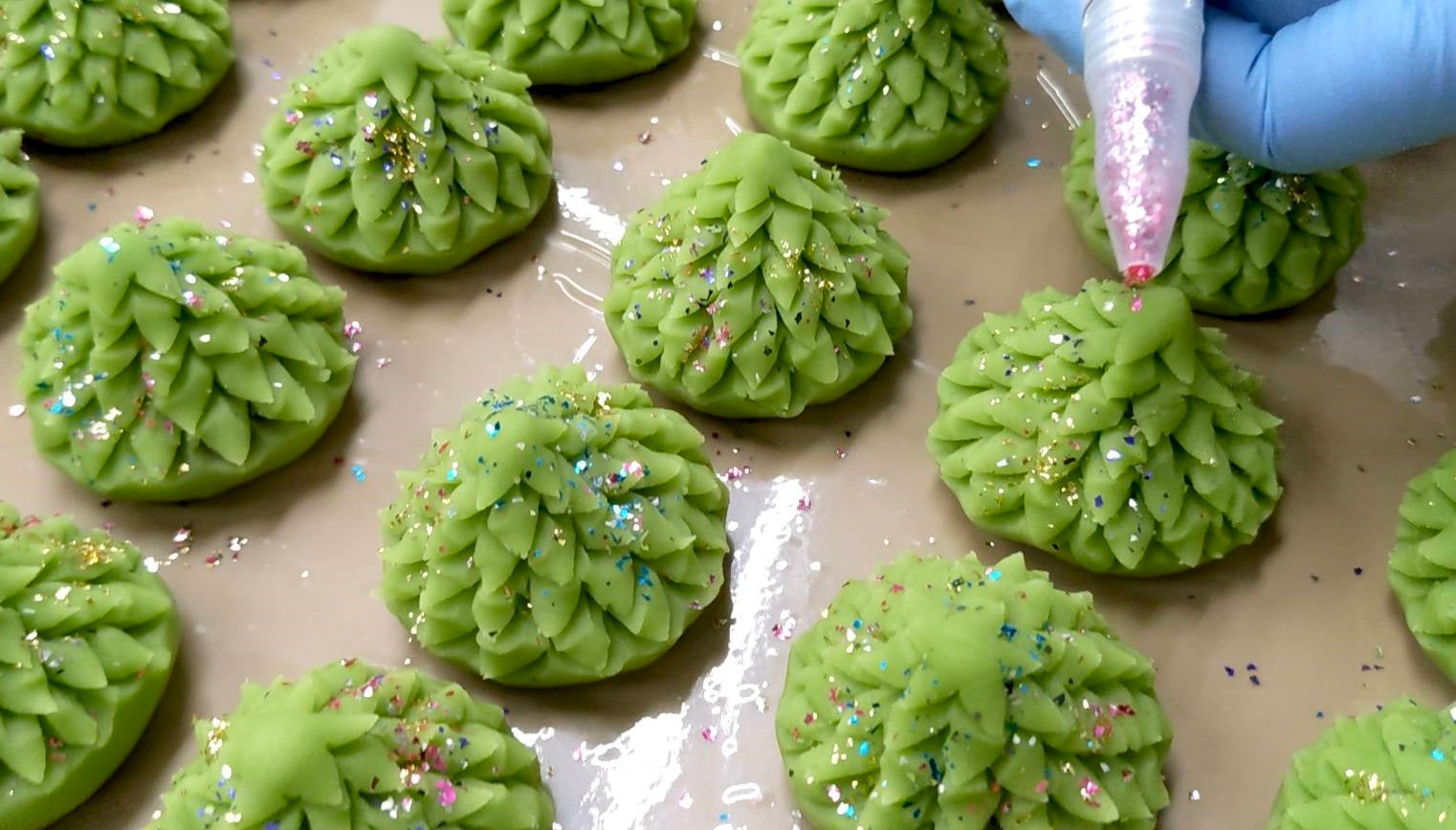 緑の練り切り餡でこし餡を包みました。職人が1つ1つ丁寧に円錐形に整えていき、練り切りバサミでツリーに見えるように切ります。さまざまな色の金箔製剤をかけて、羊羹の黄色い星をのせました。最後に、乾燥した寒天をかけて雪に見立てました。