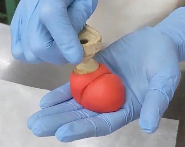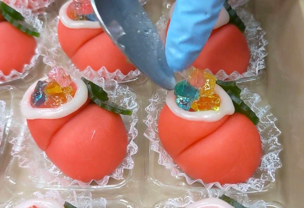 赤色の練り切り餡でこし餡を包みました。職人が1つ1つ丁寧に形を整えていきます。羊羹の緑の葉などを付けて、最後に3色(青、ピンク、黄)の寒天をのせました。