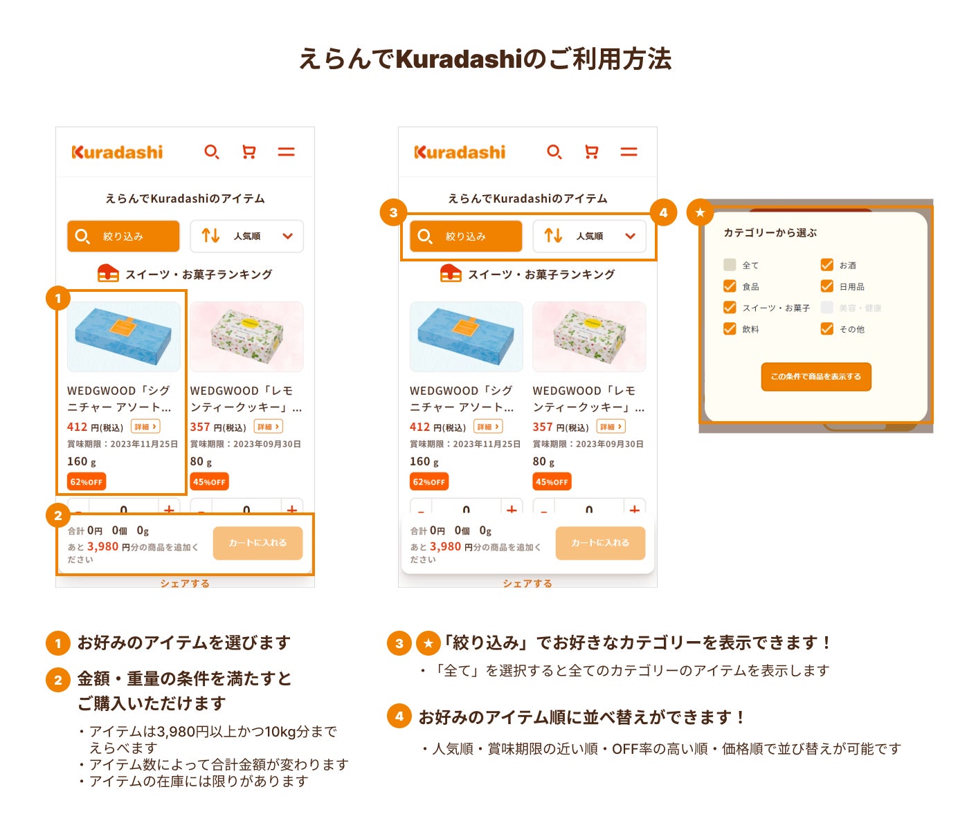「えらんでKuradashi」は、自分で作るフードロス削減BOXです。いろいろなアイテムを欲しい量だけえらんで購入することが可能です。また、商品は合計で3,980円(税込)以上かつ10kg分まで選ぶことができます。