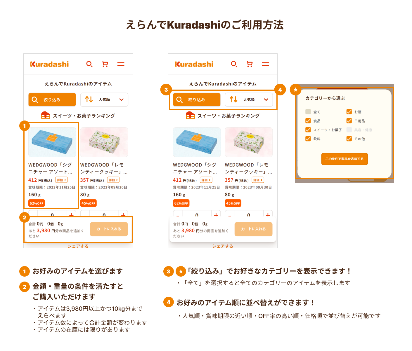 「えらんでKuradashi」は、自分で作るフードロス削減BOXです。いろいろなアイテムを欲しい量だけえらんで購入することが可能です。また、商品は合計で3,980円(税込)以上かつ10kg分まで選ぶことができます。