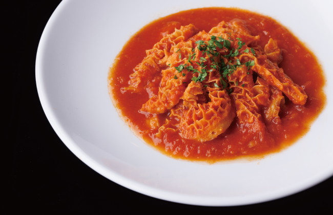 国産牛のトリッパは日本で流通しづらい実情があります。それは下処理の手間が多くコストがかかってしまうから。今回は実績のある加工場で下処理することで、国産牛のハチノスを使うことが可能になりました。イタリア産唐辛子の爽やかな辛さがきいたトマトソースで煮込む国産牛のトリッパは、クセがなくほんのりとした甘みを感じます。国産牛ならではのフワッとした柔らかな食感をお楽しみください。