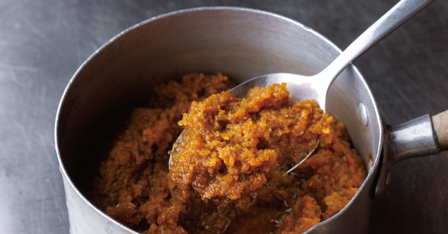 販売する2品の味の要は、イタリア料理に欠かせない「ソフリット」。玉ねぎ、にんじん、セロリを細かく刻みんで炒めたものですが、しっかりと飴色になるまで炒めるのがポイントです。今回のソフリットは、ラグーとトリッパの味に深みを持たせるために、手作業でじっくりと時間をかけて野菜の甘みとうまみを凝縮させました。このひと手間が味の違いを生み出します。