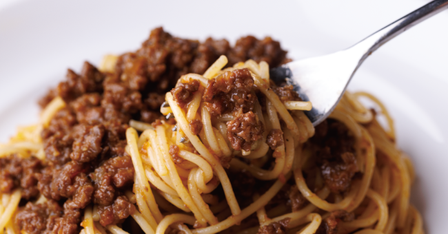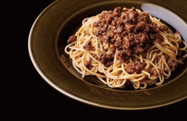 使用したのは、なかやま牧場自慢の黒毛和牛「神石牛」のすね肉。粗挽きにし、野菜のうまみをぎゅっと凝縮した「ソフリット」とともに煮込んで作りました。黒毛和牛の香りと弾力のある肉のうまみに、野菜の凝縮したコクと甘みが溶け合い、さらに全体を黒胡椒の辛味が引き締めます。牛肉の存在感を感じるラグーソースです。