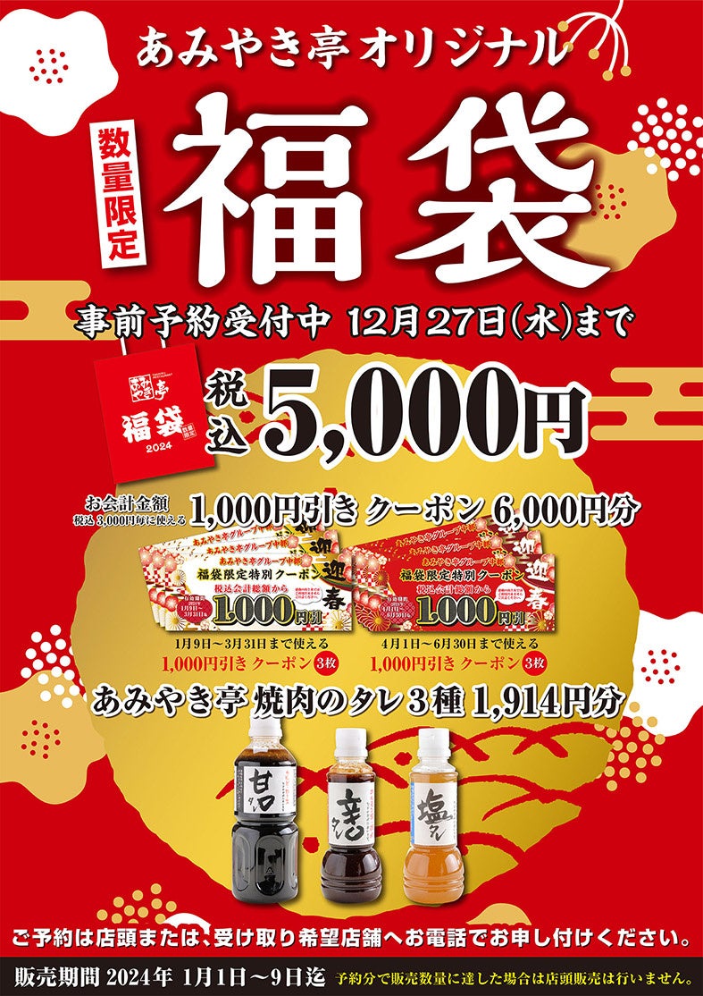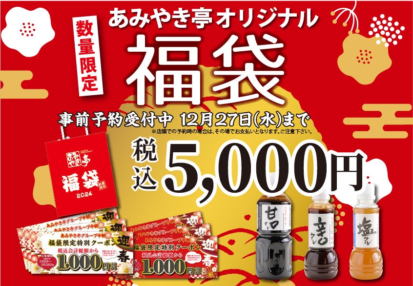 で2024年1月1日から、お得なクーポン券やあみやき亭オリジナルのタレが入った「オリジナル福袋」(税込5,000円)の販売を致します。