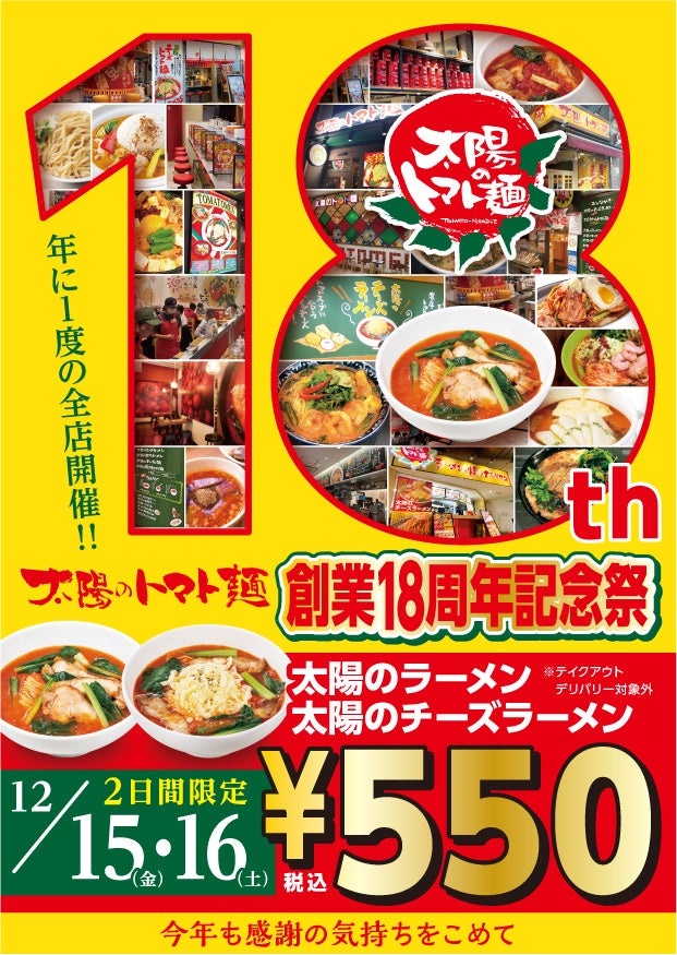~12/15&16は太陽のトマト麺で人気ラーメンを超オトクに!~
