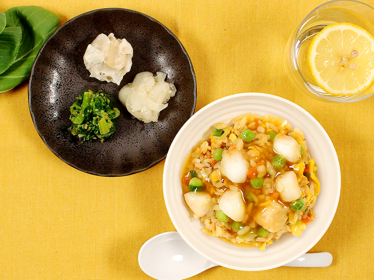イタヤ貝の小柱を使用して、オイスターソースを隠し味に使用した鶏ガラスープの餡をかけた、あんかけ炒飯です。グリンピースをトッピングに使用しました。餡とご飯をよく絡めて、お召し上がりください。