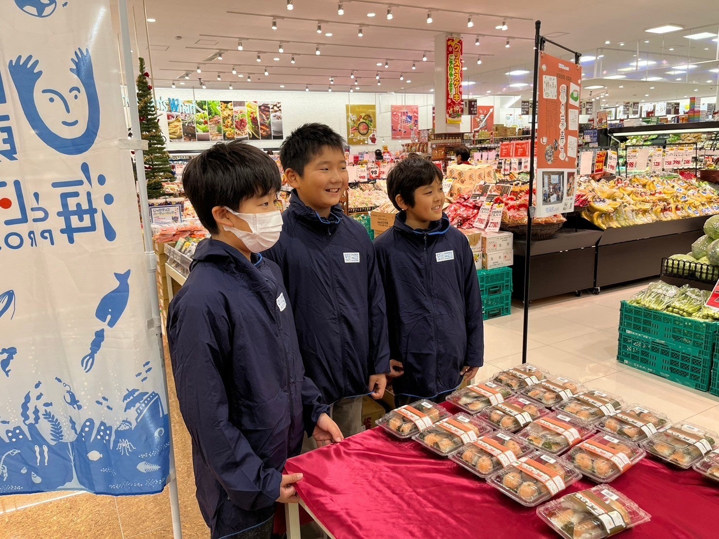 12月3日(日)には、エスマートつのい店(鳥取県鳥取市)で販売会を開催しました。体験学習に参加した3人の児童が店頭に立ち、「僕たちがパッケージをデザインした柿の葉寿司です!美味しいですよ。」と商品をPRしました。初めは、声も小さかったとっとり海調査隊の3人ですが慣れてくると積極的にお客さんに声をかけ、用意した30個の柿の葉寿司がわずか50分で完売となりました。今後、鳥取県東部のスーパーマーケットのほか物産館などでも販売する予定です。