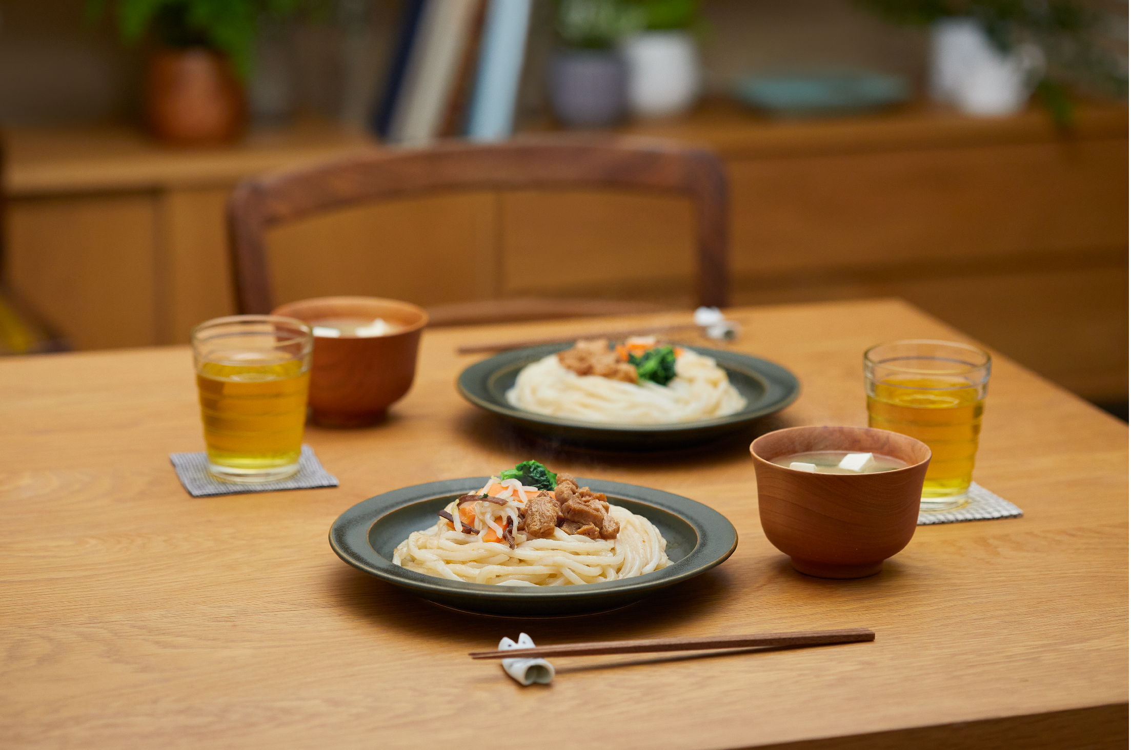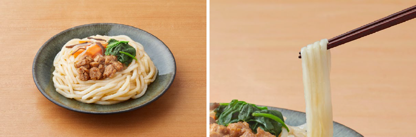 通常うどんの主原料となる小麦粉にはグルテンが含まれており、生地の”繋ぎ”となる役割があります。一方、米粉にはグルテンが含まれないため、製麺する際に生地がまとまりづらい・途中で切れてしまうなど、試行錯誤しなければならない場面が多々ありました。しかし、これまで培ってきた冷凍うどん作りのノウハウを活かし、今回、独自開発のおいしい「米粉麺」の商品化実現に至りました。