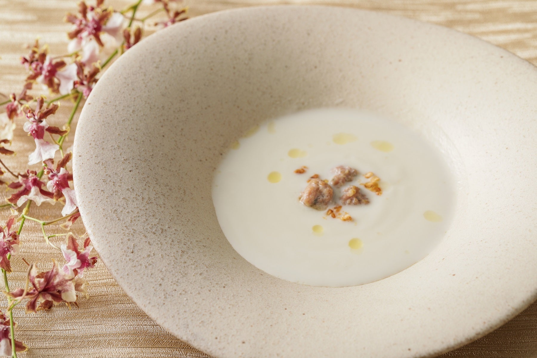 カリフラワーのポタージュ みかわポークの自家製サルシッチャを浮かべて