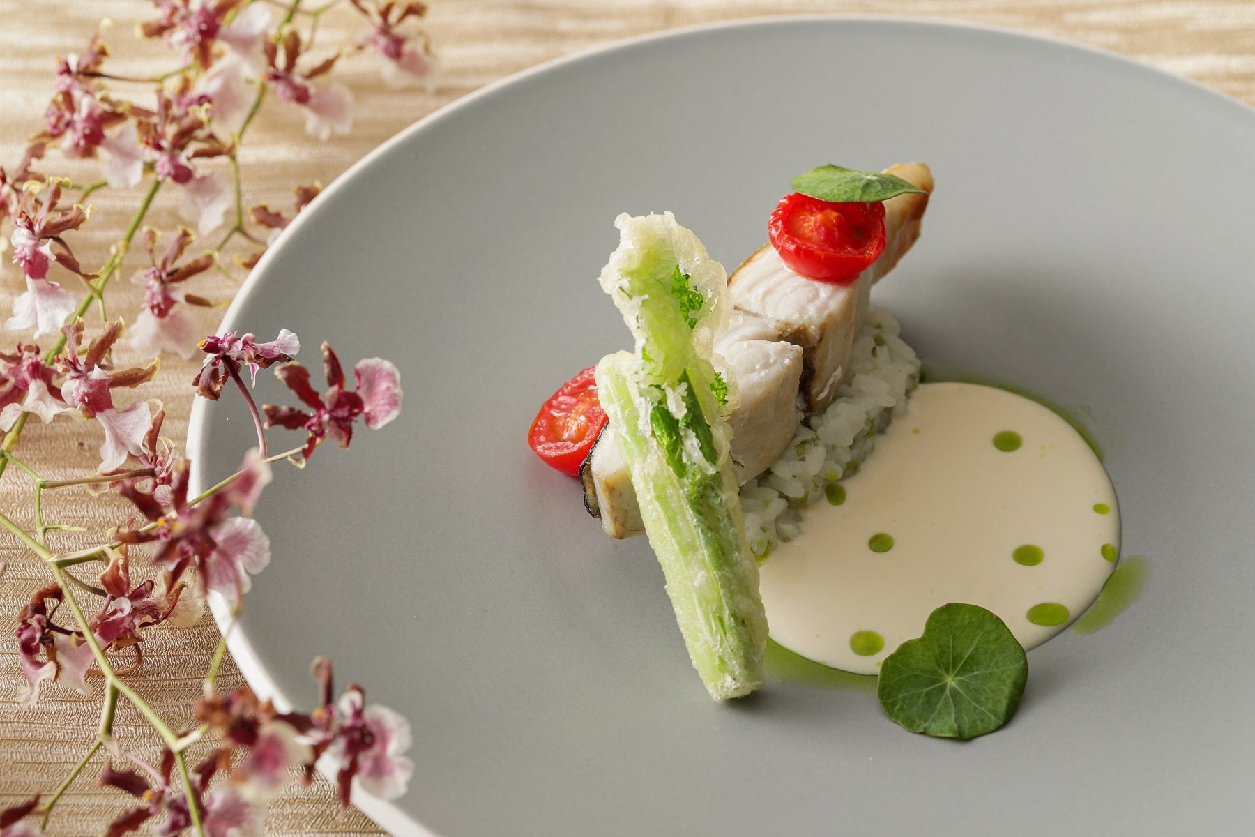 「今お召し上がりいただきたい、季節ならではの美味しいものを」をコンセプトとし、今回はズワイガニや寒ブリ、寒鰆などをラインナップ。また、地元東海三県の食材も多数取り入れ、地元愛知県からは、きめ細かな肉質と上質な脂が特徴の”みかわポーク”のサルシッチャを浮かべたポタージュスープ、柔らかな味と香りが口の中で広がる”あいち牛”のロースト、甘みの中にもしっかりとした酸味のある”紅ほっぺ(いちご)”とチョコレートを使用したスイーツをお召し上がりいただけます。隣接する三重県からは、旬の”あおさのり”と”菜の花”を使用し、旨味が凝縮されたリゾットをお楽しみいただけます。
