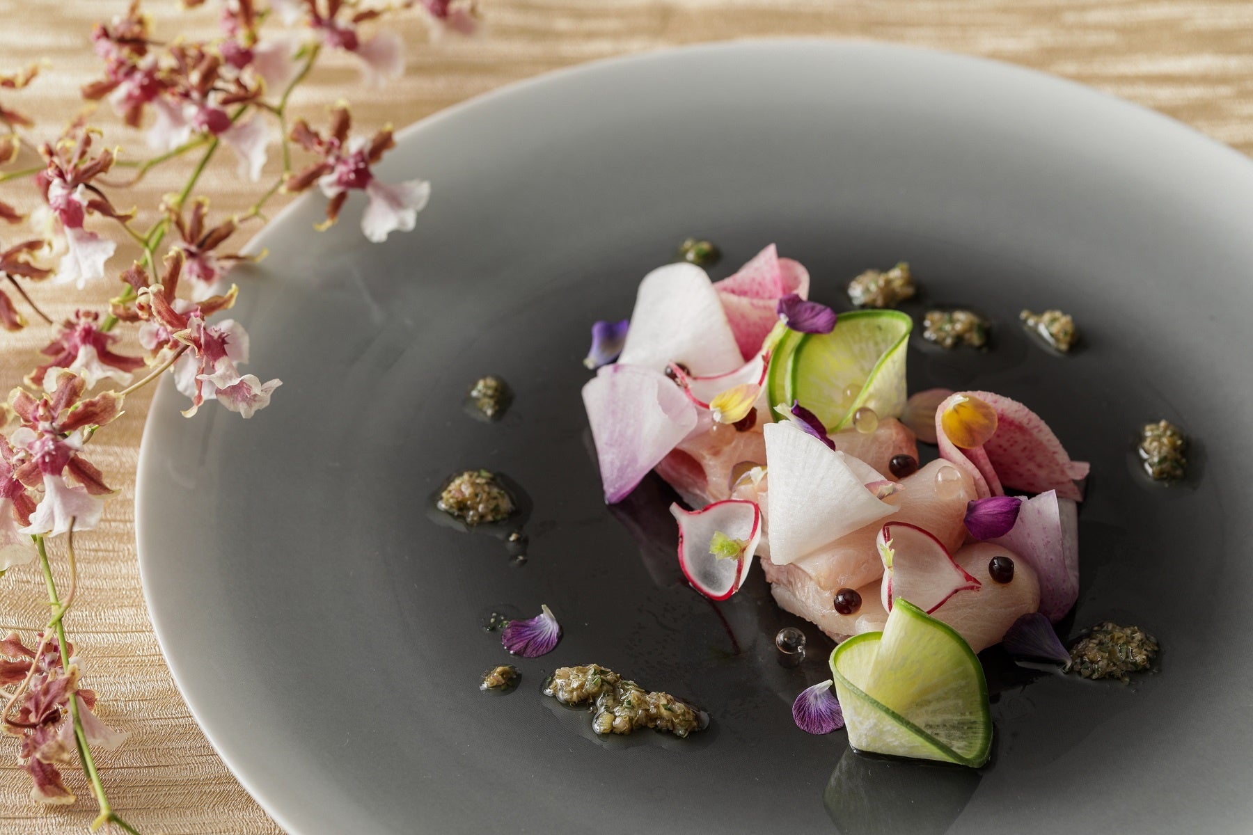 寒ブリのカルパッチョ 茗荷とケッパーのコンディメント 彩りラディッシュのサラード
