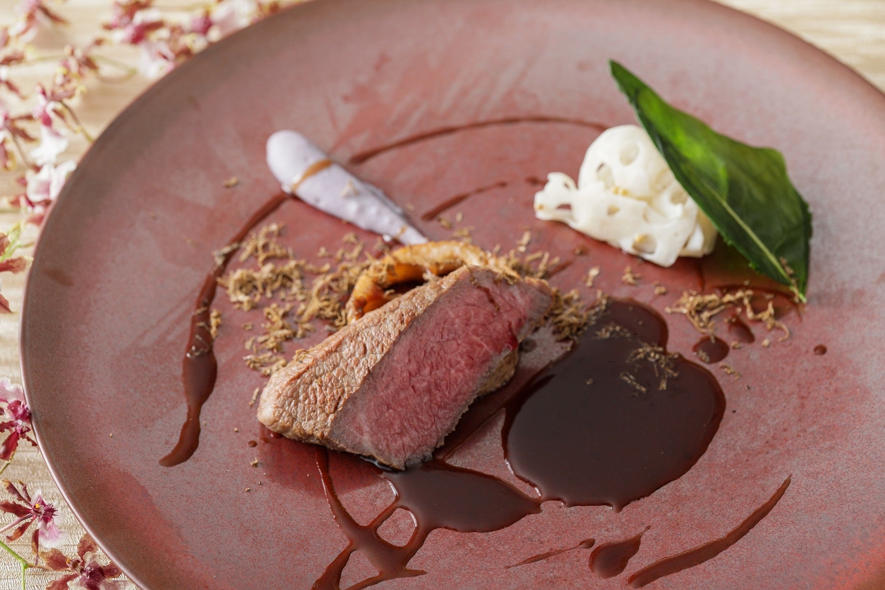 あいち牛のロースト マデラ酒のソース トリュフと愛知県産蓮根のソテーと共に