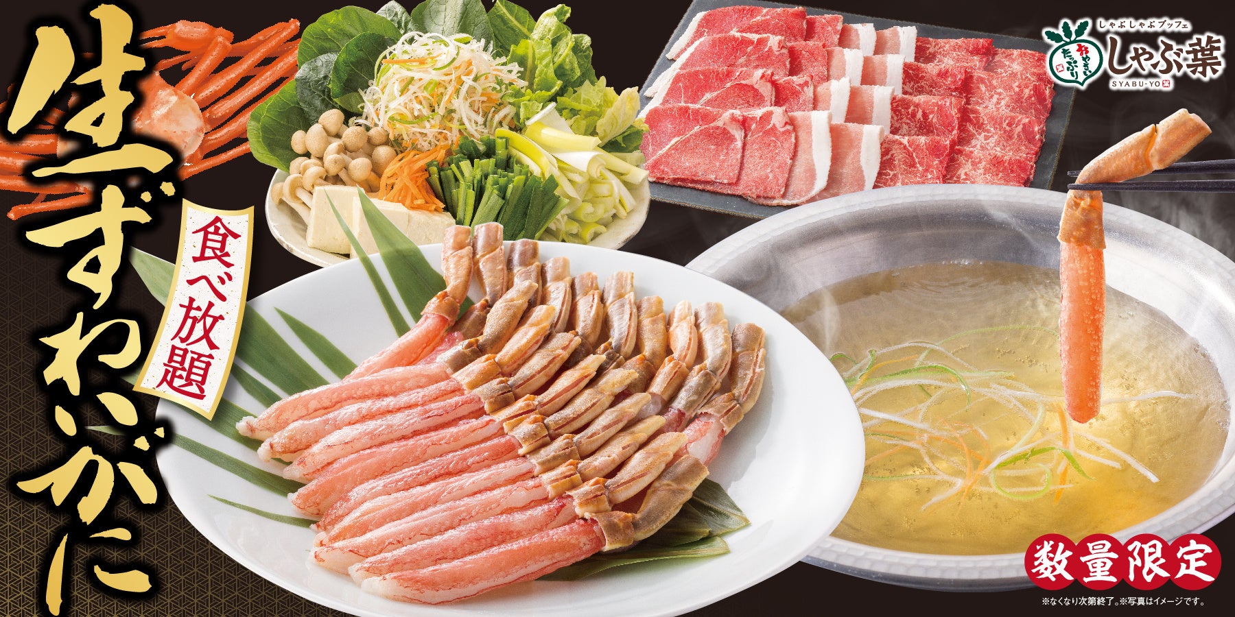 【生・本ずわいがに 食べ放題 おすすめポイント】 ①生ずわい蟹の食べ放題がしゃぶ葉で初登場! 蟹はカットした食べやすい脚のみご提供。蟹から出る美味しいだしで〆まで存分に味わえます。 ②コスパ抜群!国産牛や霧島黒豚、新鮮野菜も楽しめて税込6,599円~ シニアは税込1,100円引き、小学生は半額。ご家族に合った“アレンジ蟹鍋”を楽しめます。 |