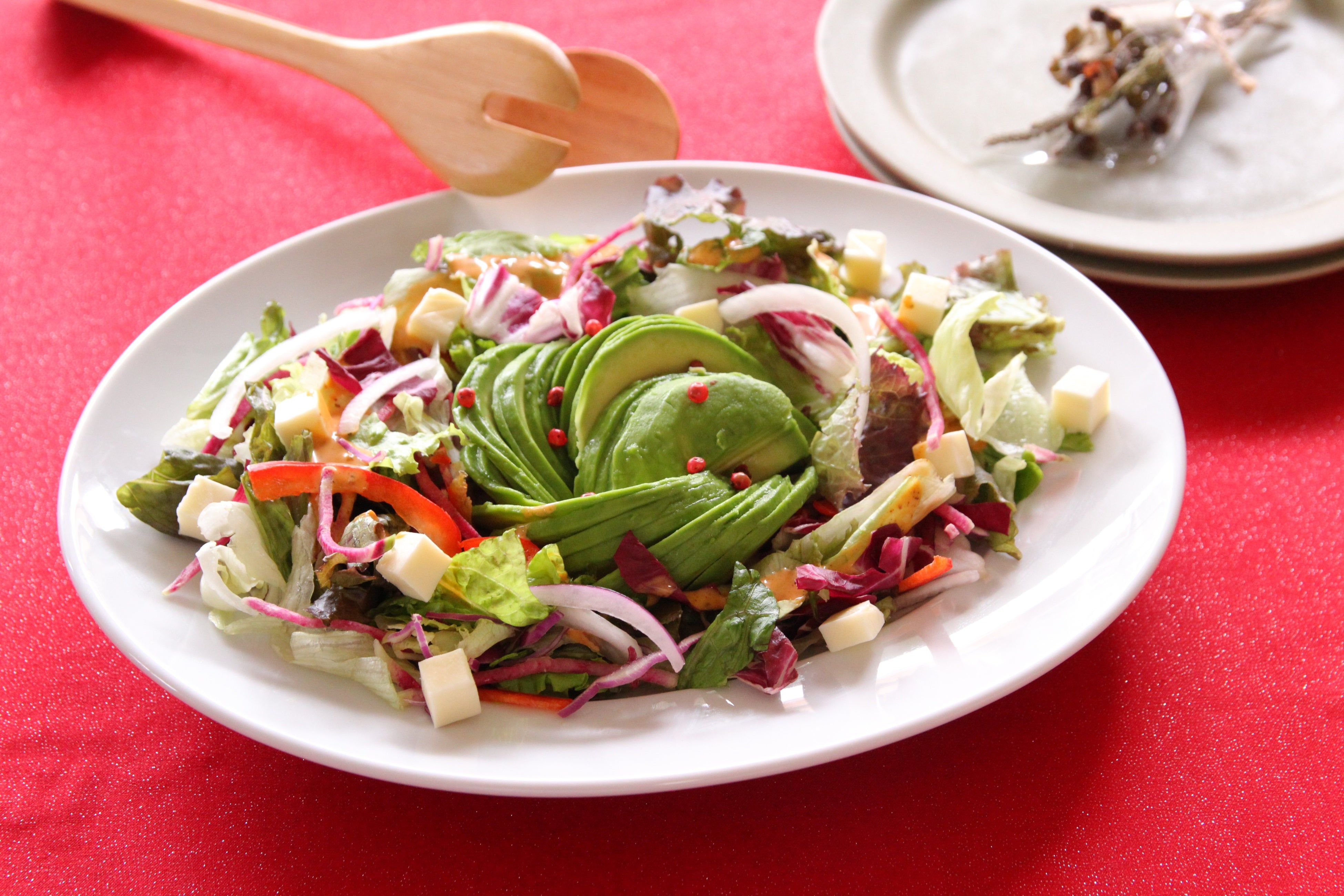 ④ 角切りチーズを散らしキユーピー コブサラダドレッシングをかけて、アボカドにお好みでピンクペッパーを散らして完成!