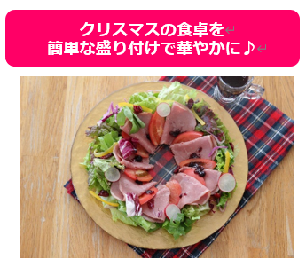③ お皿に「クリスマスに作ろう リースサラダ」をリース状に盛りつける。