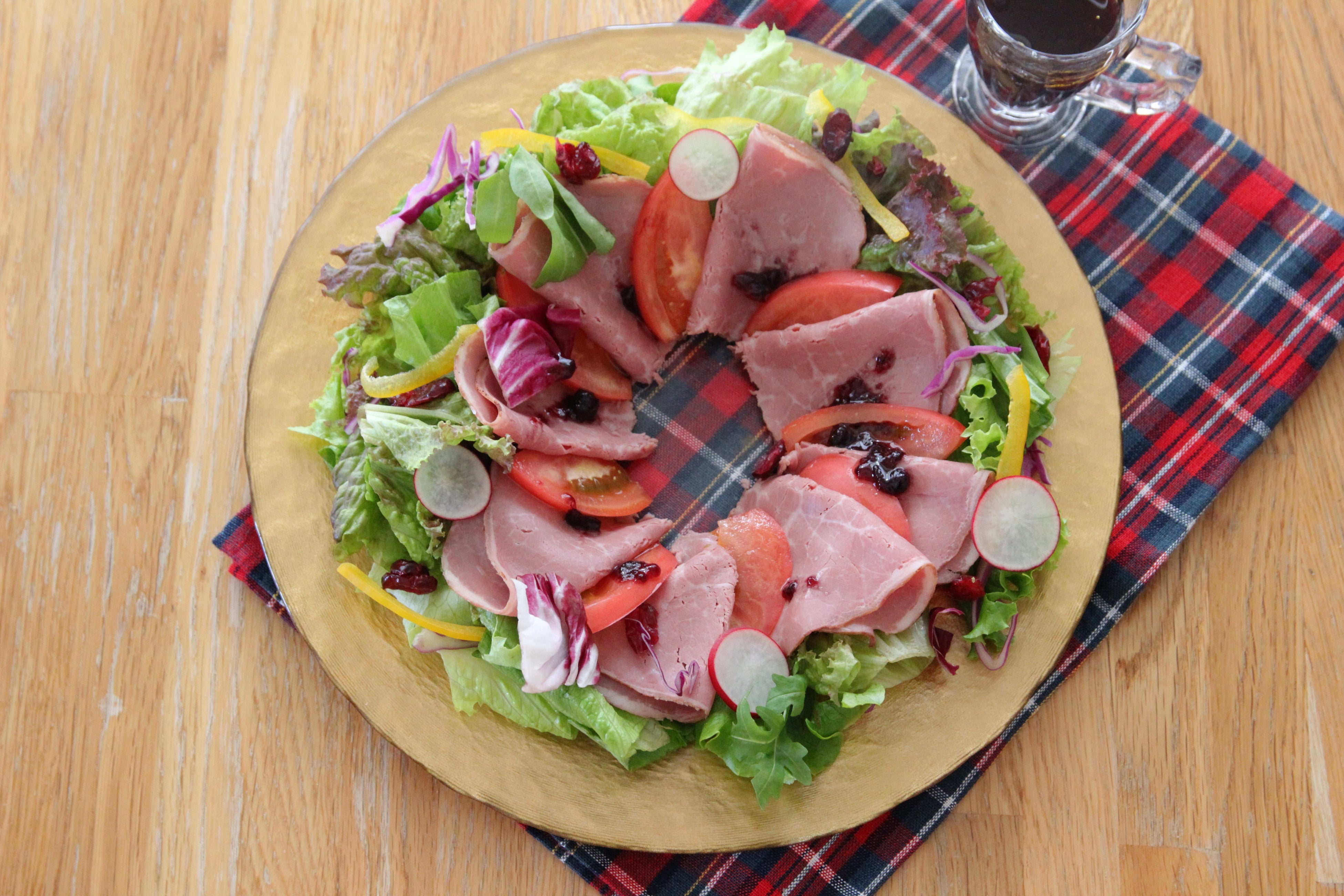 クリスマスカラーの赤の食材をたっぷり使ったリースサラダです。ジャムを使ったドレッシングはローストビーフなどのお肉を使ったサラダにぴったりです。