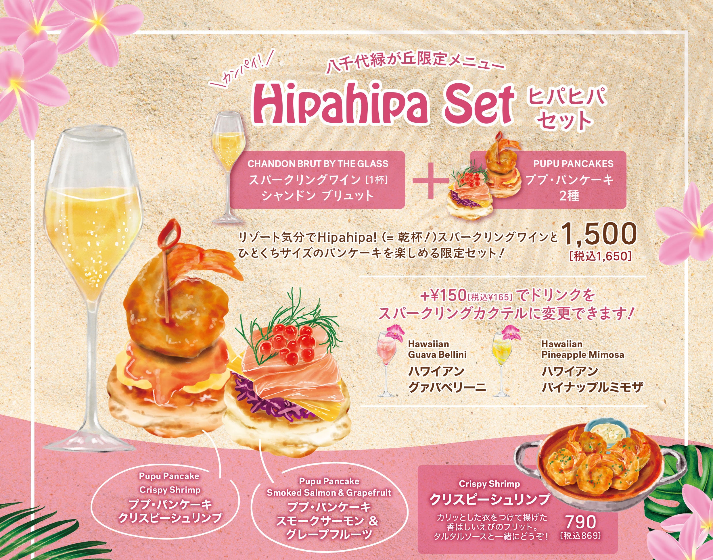また、ハワイのお酒を使ったアルコールメニューも豊富に取り揃えており、八千代緑が丘店限定の乾杯セットメニューとしてエビやスモークサーモンを使ったひとくちサイズのパンケーキ(2種)とスパークリングワインをセットにした「Hipahipa Set」をご用意します。