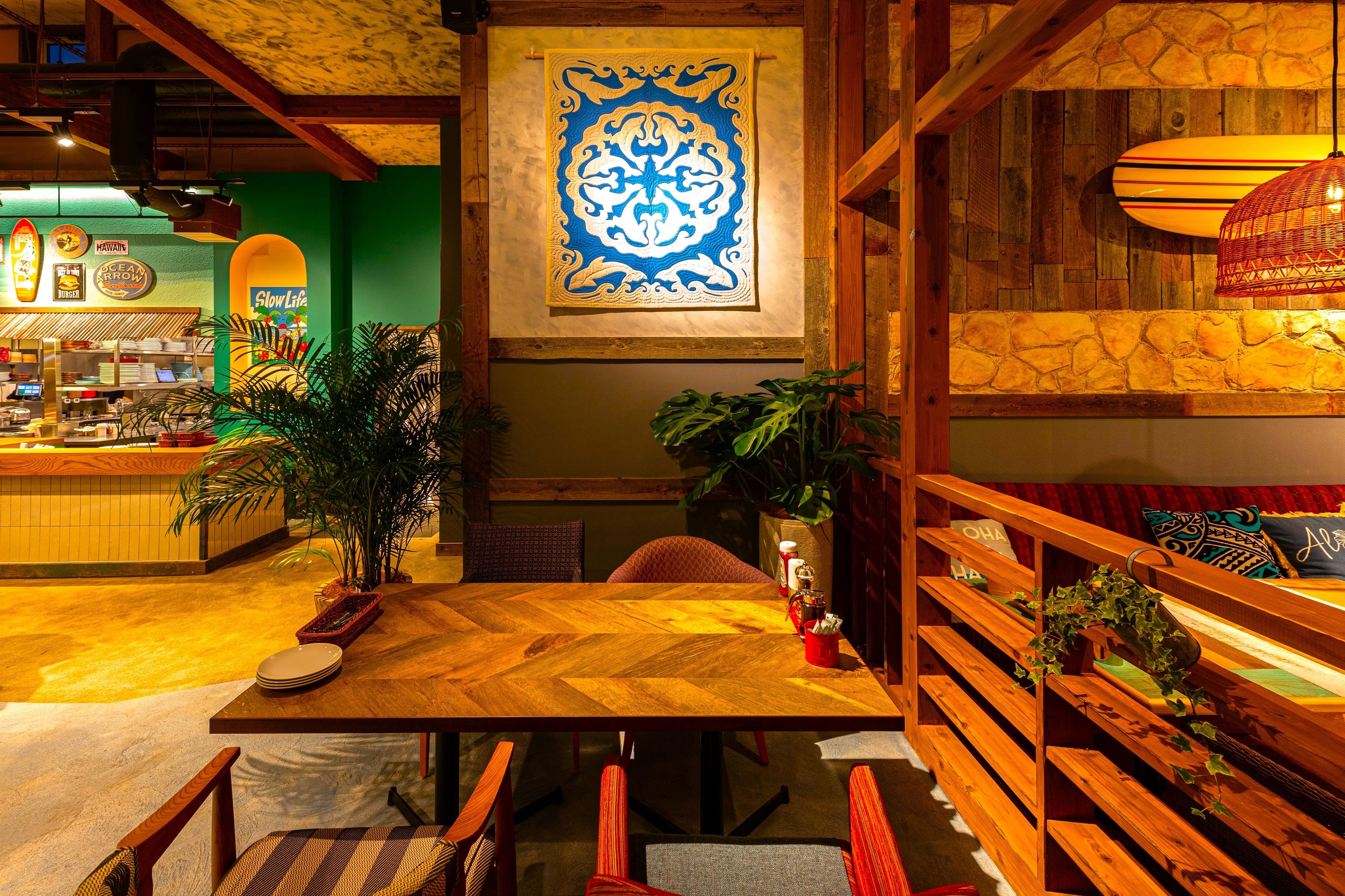 カラフルなハワイアン雑貨やサーフボードが飾られ、遊び心のあるソファやテーブルなどのこだわりのインテリアが、まるで、ハワイのローカルのリビングにいるような雰囲気を演出します。ゆったりとくつろげる空間で、日本にいながらハワイ気分を味わえます。