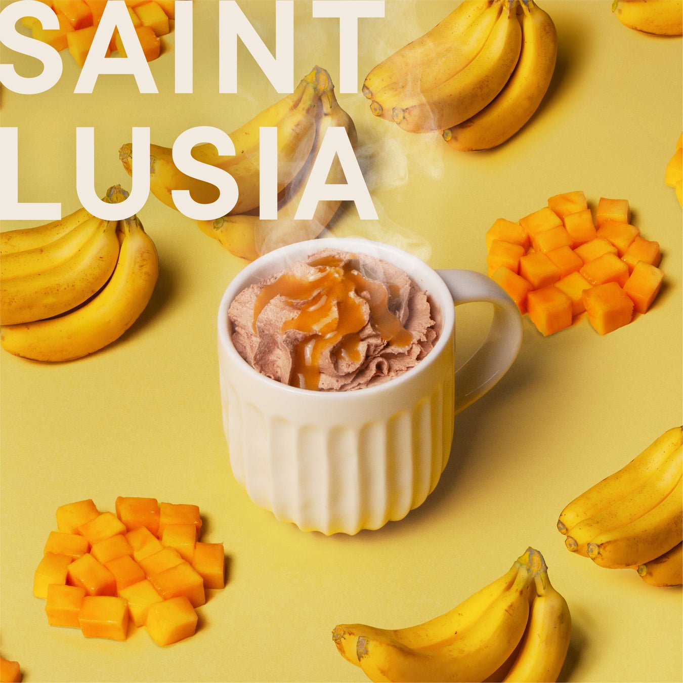 セントルシア島でも栽培されている果物、「バナナ」や「マンゴー」がアマゾンカカオとコラボレーション。 カリブの⾵が舞い込む、贅沢なホットフルーツドリンクで冬の寒さを吹き⾶ばします。