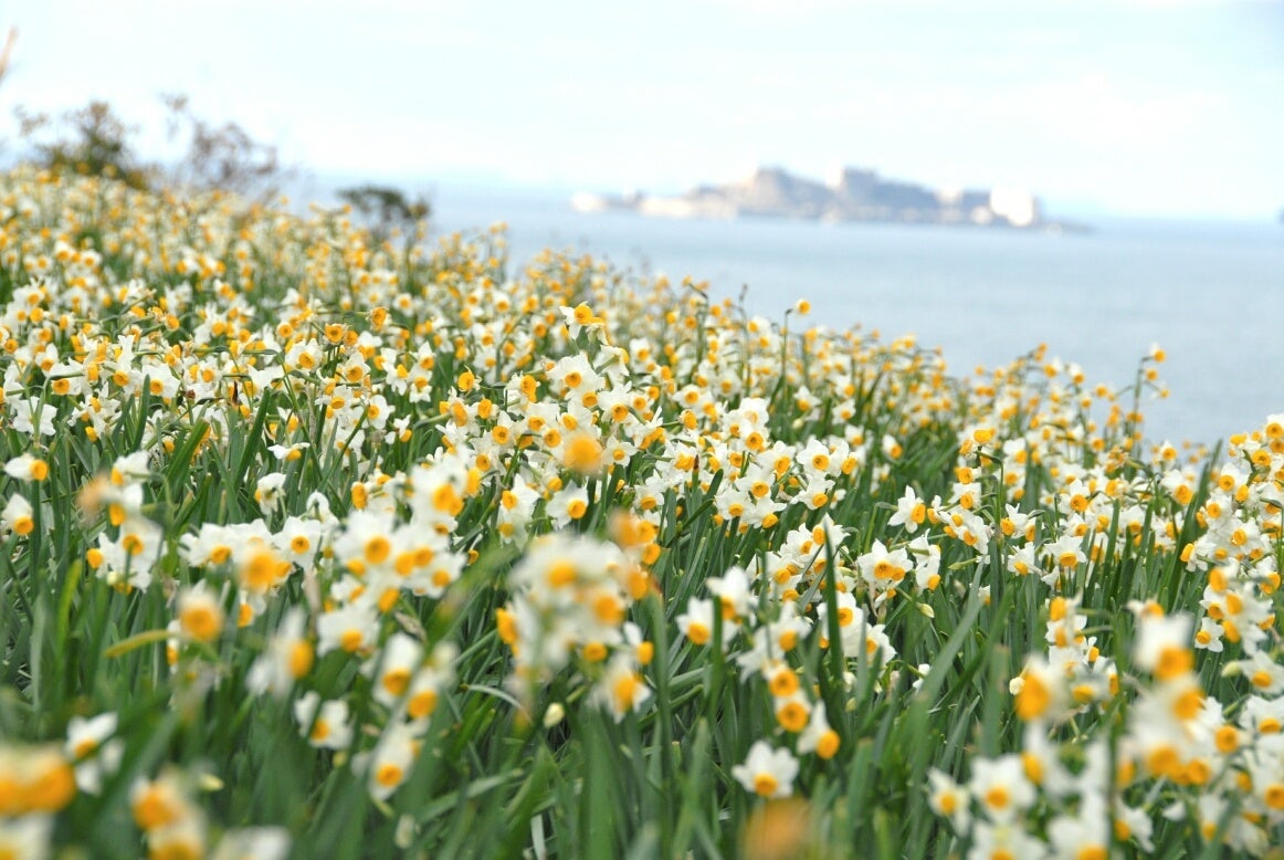 ① のもざき水仙まつりの会場からは晴れた日には軍艦島も眺められます。